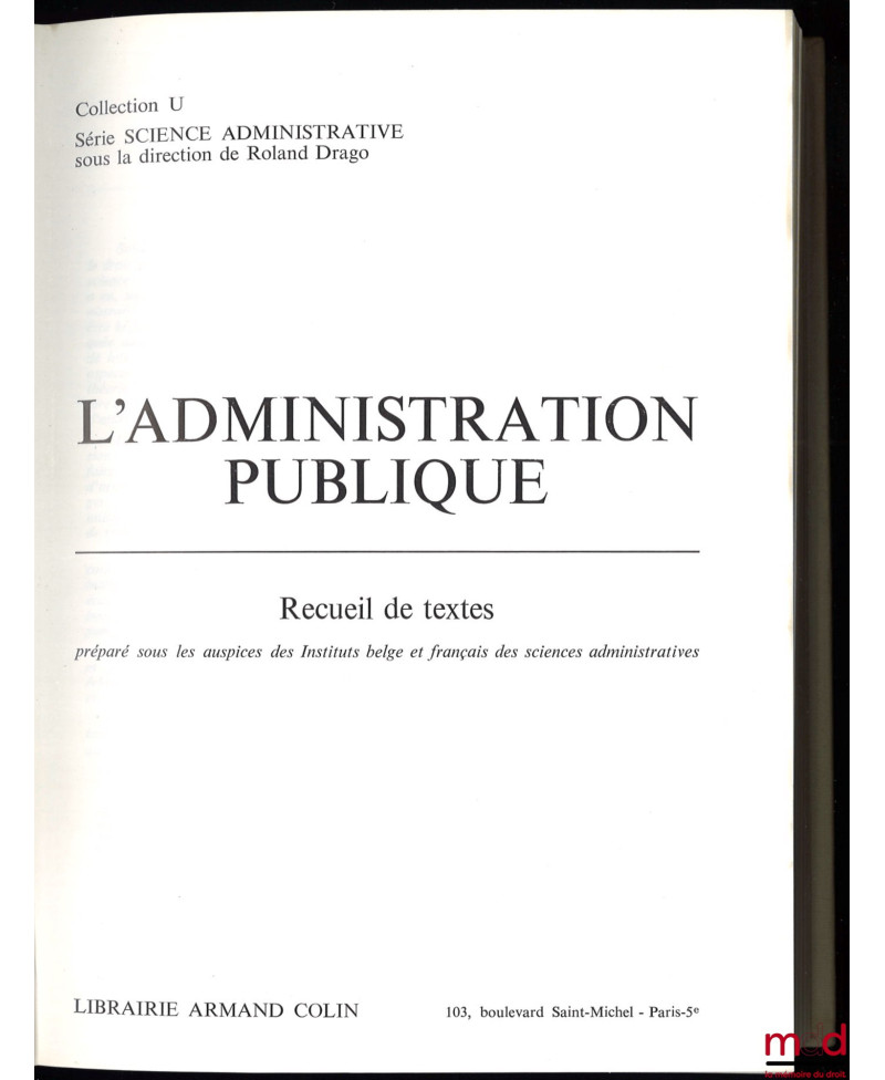 L’ADMINISTRATION PUBLIQUE, Recueil de textes préparé sous les auspices des Instituts belge et français des sciences administratives, coll. U, série : Science Administrative