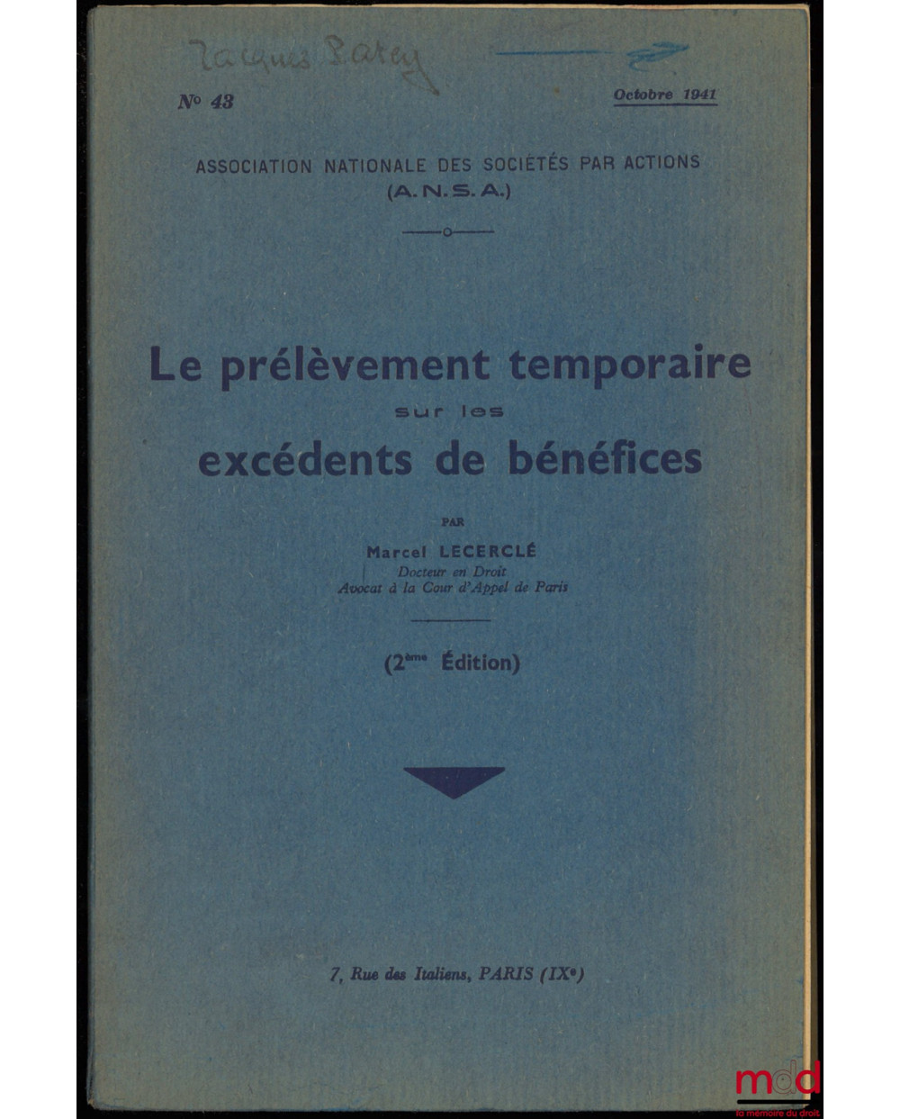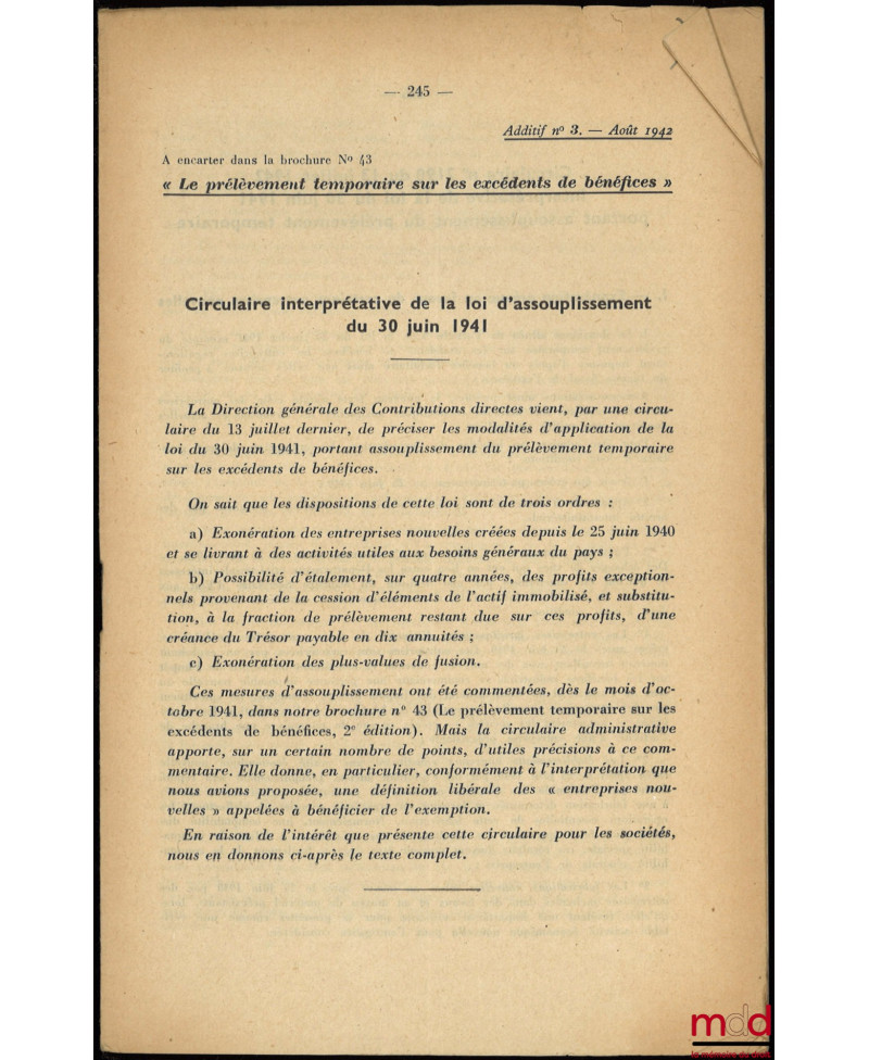 LE PRÉLÈVEMENT TEMPORAIRE SUR LES EXCÉDENTS DE BÉNÉFICES, A.N.S.A. (Association Nationale des Sociétés par Actions), n° 43/1941, 2ème éd., accompagné de son additif n°3 d’août 1942 sur la CIRCULAIRE INTERPRÉTATIVE DE LA LOI D’ASSOUPLISSEMENT DU 30 JUIN 1941