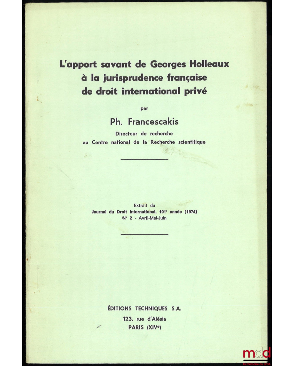 L’APPORT SAVANT DE GEORGES HOLLEAUX À LA JURISPRUDENCE FRANÇAISE DE DROIT INTERNATIONAL PRIVÉ, Extrait du Journal du Droit internation [Clunet], 1974, n° 2, avr.-mai-juin