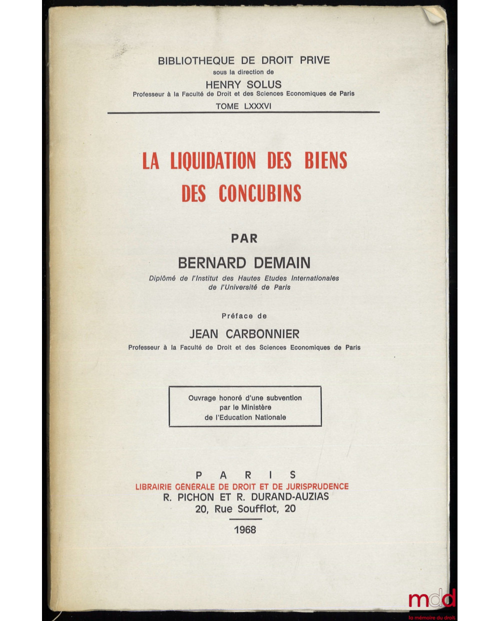 LA LIQUIDATION DES BIENS DES CONCUBINS, Préface de Jean Carbonnier, Bibl. de droit privé, t. LXXXVI