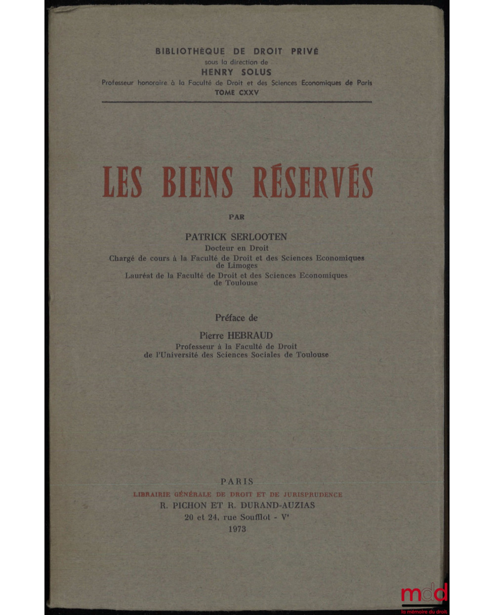 LES BIENS RÉSERVÉS, Préface de Pierre Hébraud, Bibl. de droit privé, t. CXXV
