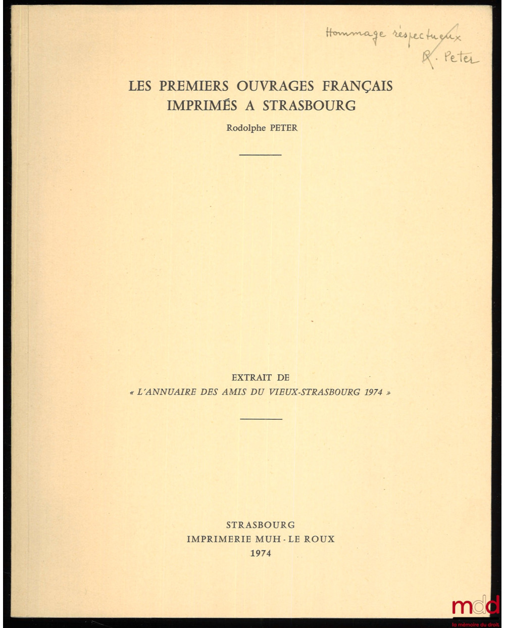 LES PREMIERS OUVRAGES FRANÇAIS IMPRIMÉS À STRASBOURG, extrait de L’Anuaire des amis du Vieux-Strasbourg 1974