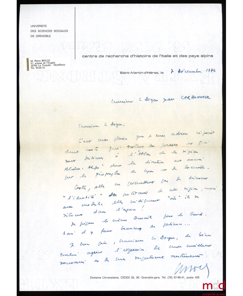 Description : 2 vol., feuillets colorés, lettre d’ENVOI de Pierre Bolle adressant à Jean Carbonnier ces deux cartes « sortant des presses » et destinées à l’Atlas de la région Rhônes Alpes, bon état, [Cet ouvrage provient de la bibliothèque personnelle du professeur Jean Carbonnier (1908-2003)], 2 ff.