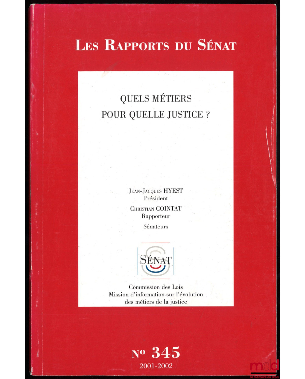 QUELS MÉTIERS POUR QUELLE JUSTICE ? Rapport d’information n° 345 fait au nom de la commission des Lois constitutionnelles, de législation, du suffrage universel, du Règlement et d’administration générale par la mission d’information sur l’évolution des métiers de la justice, Jean-Jacques Hyest, Président ; Christian Cointat, Rapporteur, coll. Les Rapports du Sénat