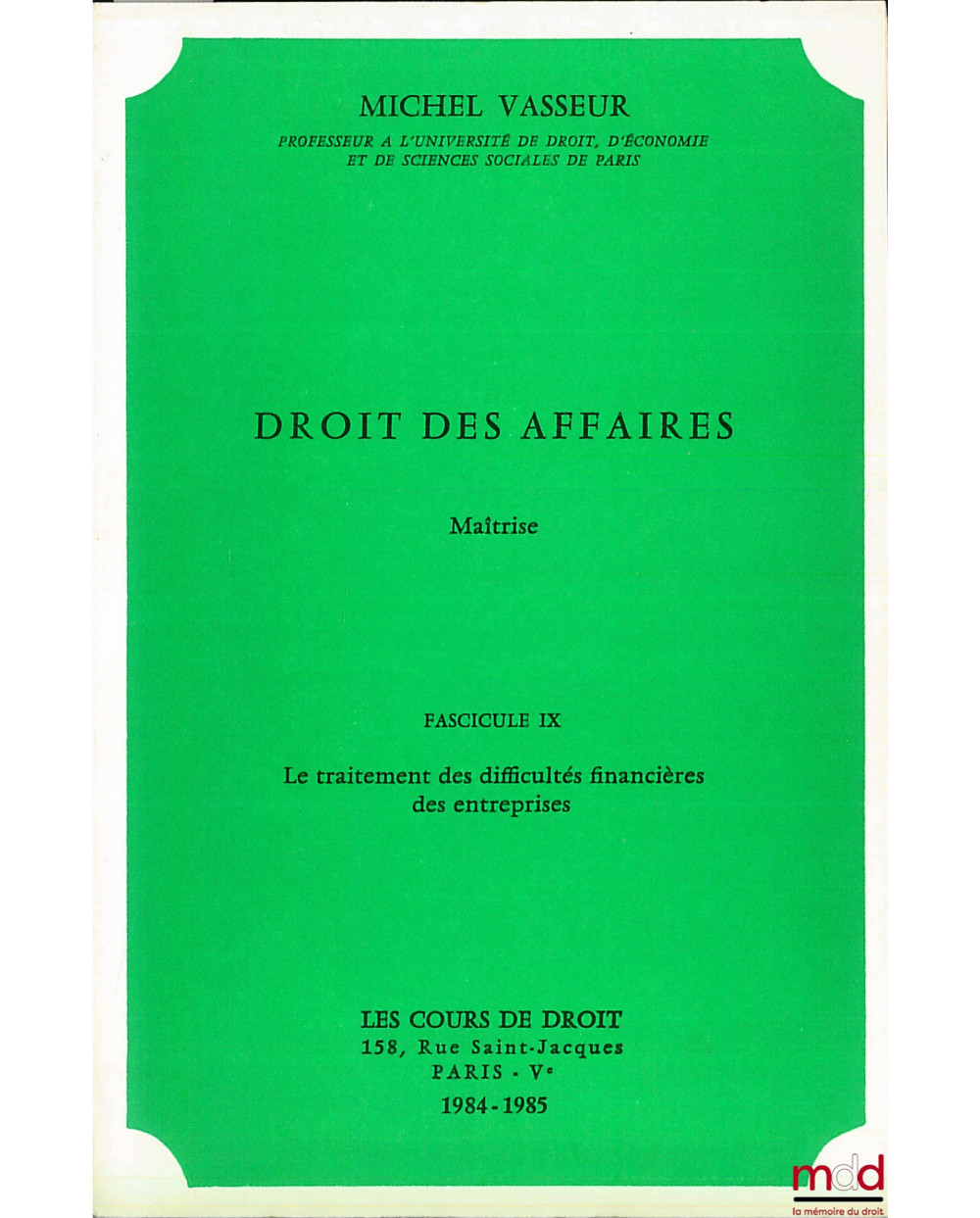 DROIT DES AFFAIRES, Maîtrise, fasc. IX, année 1984-1985 : LE TRAITEMENT DES DIFFICULTÉS FINANCIÈRES DES ENTREPRISES
