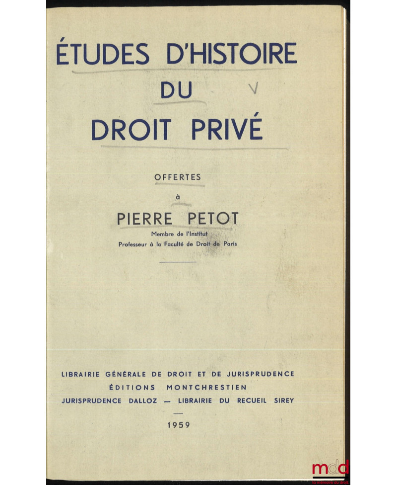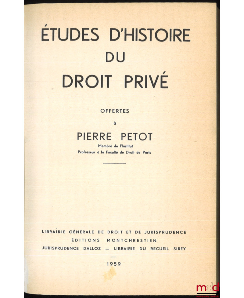 ÉTUDES D’HISTOIRE DU DROIT PRIVÉ OFFERTES À PIERRE PETOT