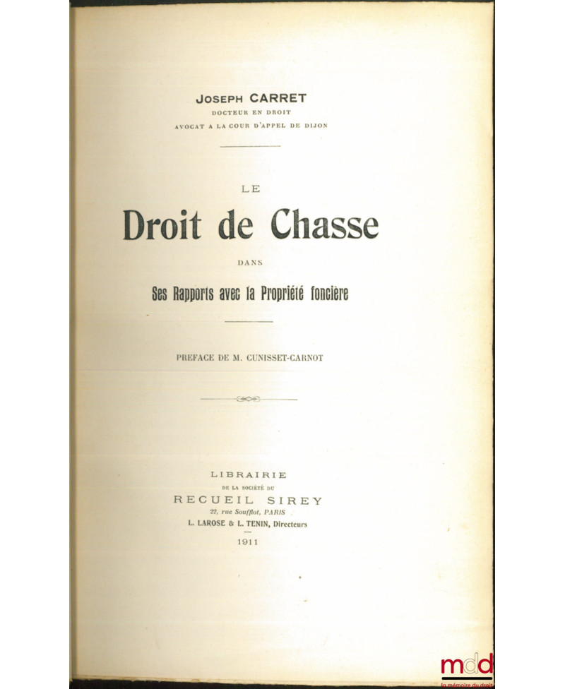 LE DROIT DE CHASSE DANS SES RAPPORTS AVEC LA PROPRIÉTÉ FONCIÈRE, Préface de M. Cunisset-Carnot