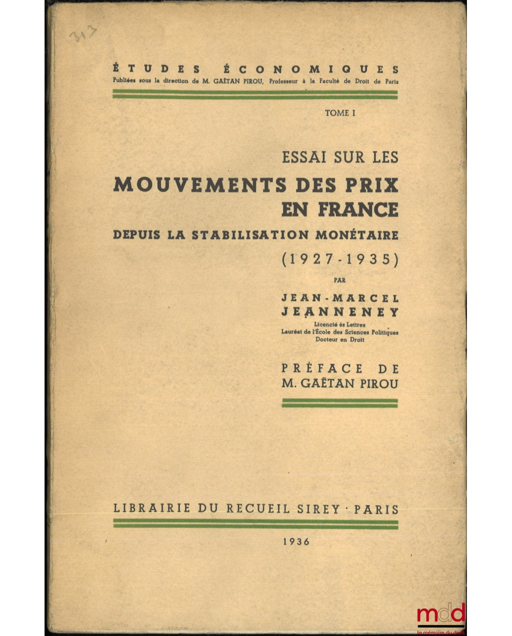ESSAI SUR LES MOUVEMENTS DES PRIX EN FRANCE depuis la stabilisation monétaire (1927-1935, Préface de Gaêtan Pirou, coll. Études économiques, t. I