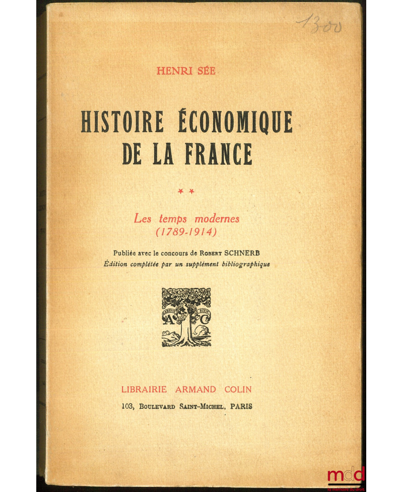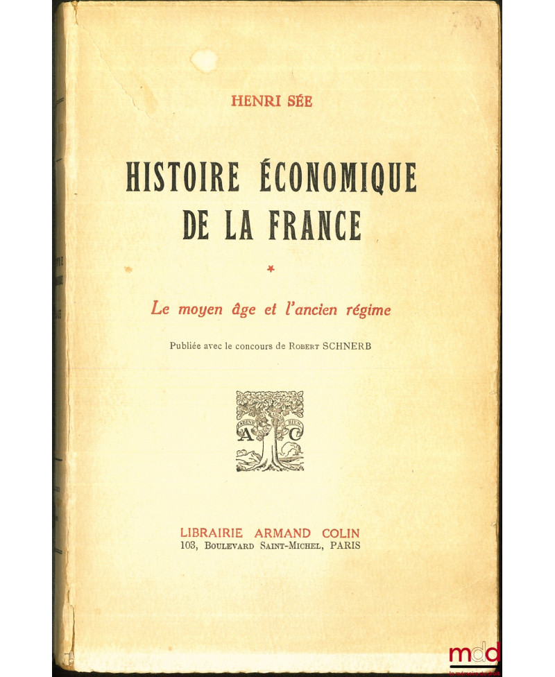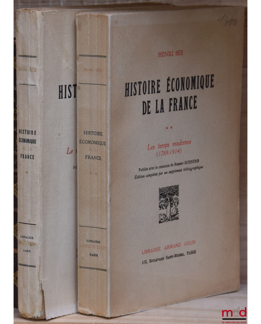 HISTOIRE ÉCONOMIQUE DE LA FRANCE, Préface de Armand Rébillon (t. 1) et Henri Hauser (t. 2), publié avec le concours de Robert Schnerb :t. 1 : Le Moyen Âge et l’Ancien Régime ;t. 2: Les temps modernes (1789-1914)