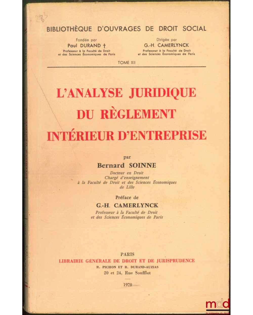 L’ANALYSE JURIDIQUE DU RÈGLEMENT INTÉRIEUR D’ENTREPRISE, Préface de Guillaume-Henri Camerlynck, Bibl. d’Ouvrages de Droit social, t. XII