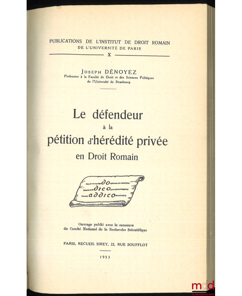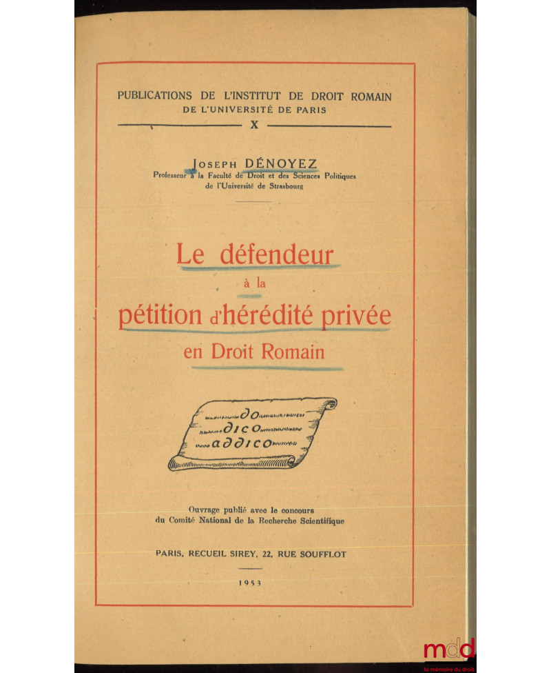 LE DÉFENDEUR À LA PÉTITION D’HÉRÉDITÉ PRIVÉ EN DROIT ROMAIN, Publications de l’Institut de Droit romain de l’Université de Paris, t. X