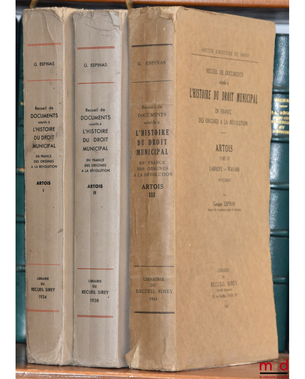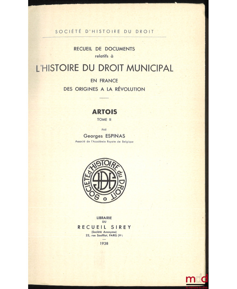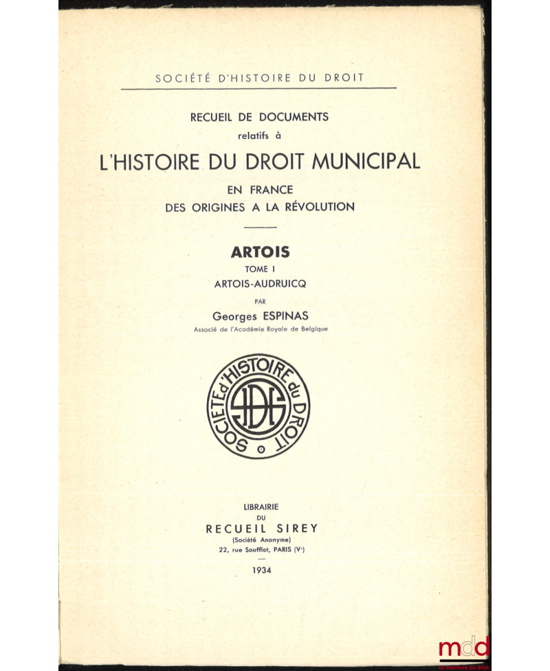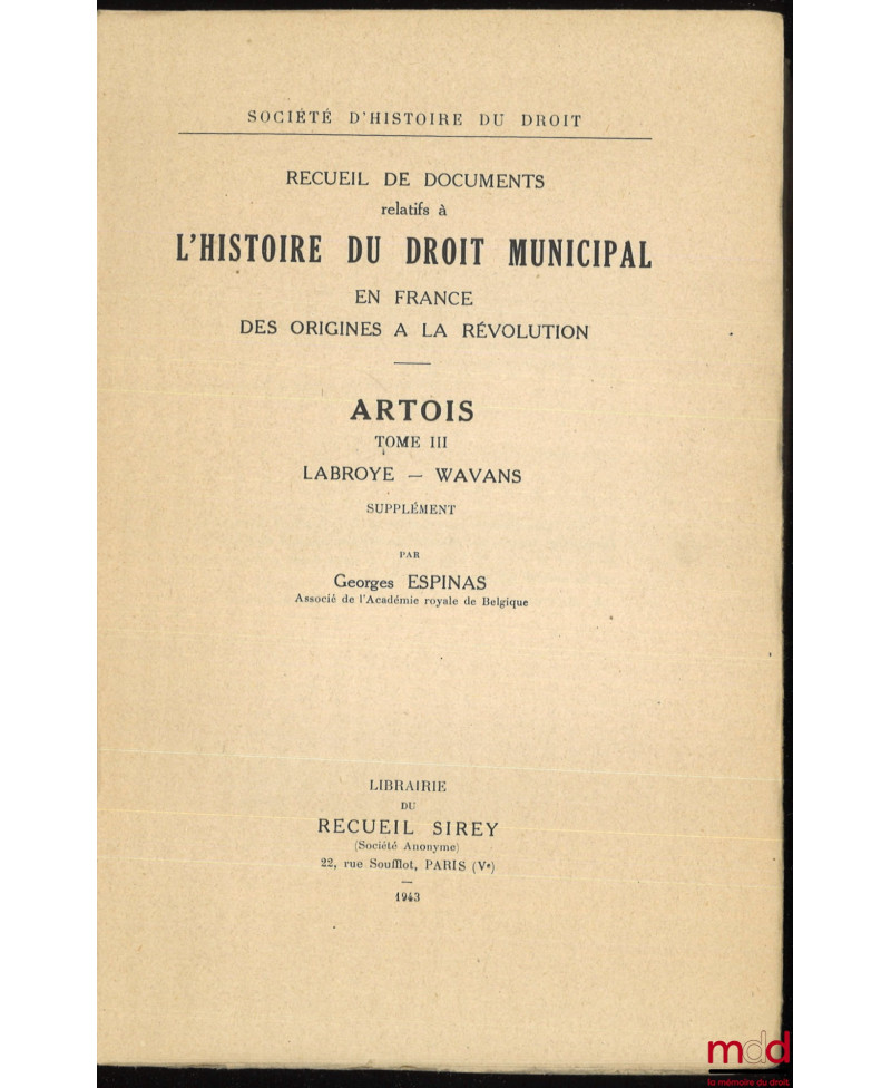 Recueil de documents relatifs à L’HISTOIRE DU DROIT MUNICIPAL en France des Origines à la Révolution. ARTOIS :t. I : Artois-Audruicq ;t. II : [Bailleul-Sir-Berthoult – Heuchin, De Lamoignon et Machault] ;t. III : Labroye – Wavans, Société d’histoire du droit