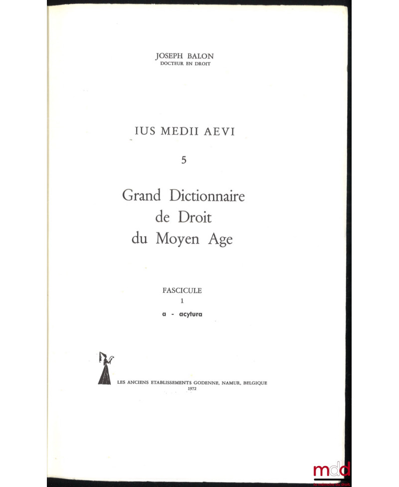 GRAND DICTIONNAIRE DE DROIT DU MOYEN ÂGE, Jus medii aevi 5, fasc. 1 [a-acytura] à 9 [castiche-chario] [seuls fascicules parus]