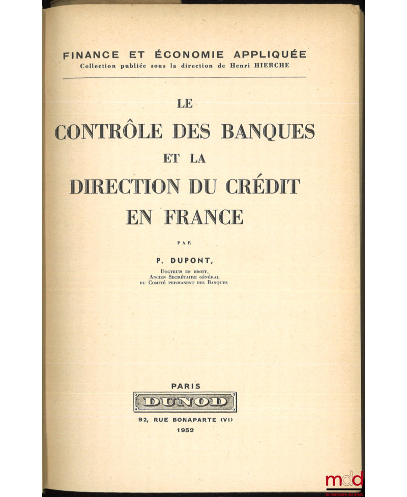 LE CONTRÔLE DES BANQUES ET LA DIRECTION DU CRÉDIT EN FRANCE, coll. Finance et économie appliquée t. II