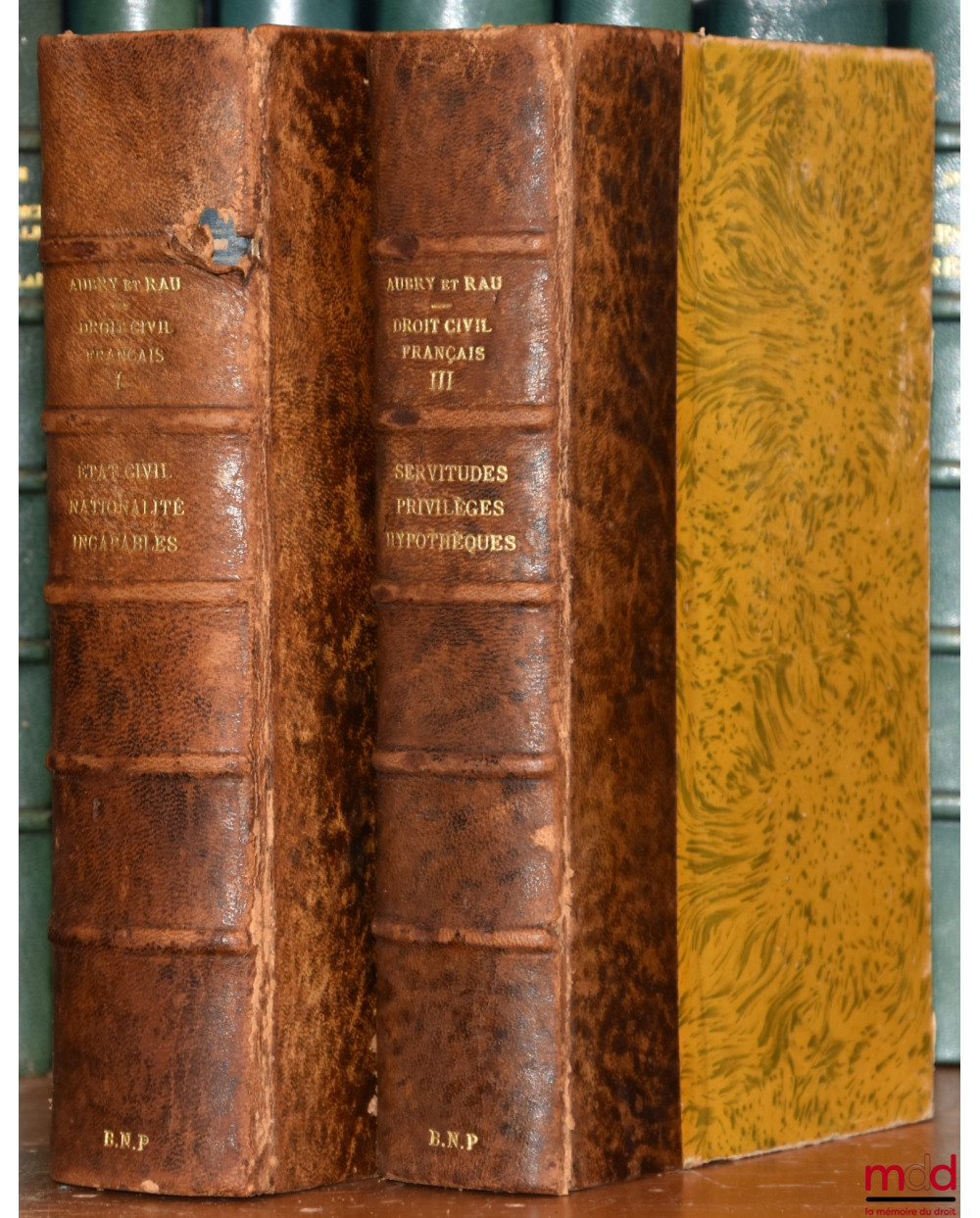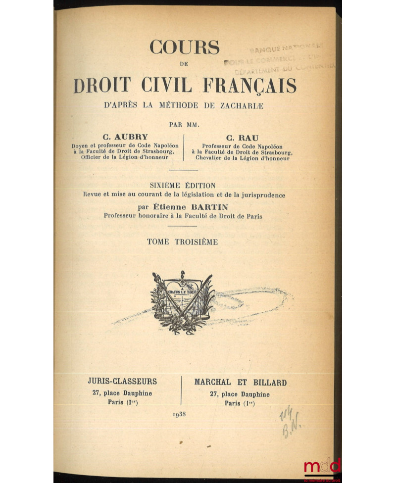 COURS DE DROIT CIVIL FRANÇAIS D’APRÈS LA MÉTHODE DE ZACHARIÆ, 6e éd. revue et mise au courant de la législation et de la jurisprudence par Étienne Bartin :t. I : État civil, nationalité, incapables ;t. III : Servitudes, privilèges, hypothèques