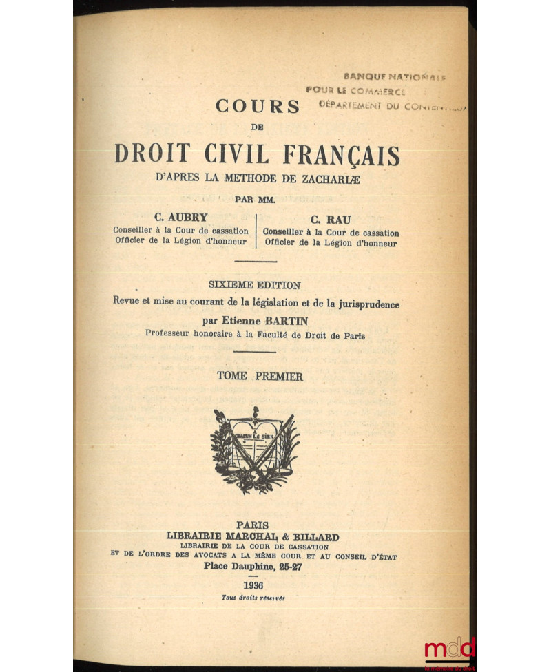 Comme le souligne J.-L. Halpérin (n° 34), Aubry et Rau « apportèrent une véritable révolution dans la méthode d’exposition du droit civil. Ne s’astreignant pas à suivre le Code Civil article par article ils cherchèrent à réaliser un traité raisonné en alliant la méthode exégétique et l’enseignement dogmatique. Ils voulurent également associer la théorie et la pratique en combinant la pure logique d’un texte précis et rigoureux avec la richesse de notes volumineuses consacrées à la jurisprudence et à la discussion des opinions ». Rappelons que les éditions postérieures n’ont connu que quelques modifications : la septième n’ayant connu que 7 volumes remaniés et la 8e, un seul. Bartin, qui n’avait révisé dans la précédente édition que les volumes V à XII correspondant aux matières qu’il affectait plus particulièrement, décide alors de terminer son travail de relecture dans une nouvelle édition. Aussi si Bartin s’expliquait dans sa préface sur la nécessité de garder de la 4e éd. le plan et de ne faire qu’une mise à jour des notes, P. Esmein entend bien ne pas se « borner à une mise au courant ». Ainsi, nous nous trouvons bien ici face à une des dernières éditions conservant réellement les références au texte original d’Aubry & Rau. Esmein n’hésitera d’ailleurs pas à démanteler la pensée de ses fondateurs pour la remplacer par une jurisprudence contemporaine contradictoire.