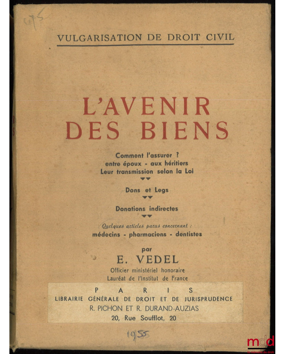 L’AVENIR DES BIENS. Comment l’assurer ? Entre époux - aux héritiers, Leur transmission selon la loi. Dons et legs. Donations indirectes. Quelques articles parus concernant : Médecins - pharmaciens - dentistes, coll. Vulgarisation de droit civil