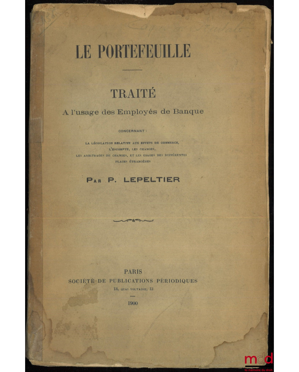 LE PORTEFEUILLE. TRAITÉ à l’usage des Employés de Banque concernant : la législation relative aux effets de commerce, l’escompte, les changes, les arbitrages de changes et les usages des différentes places étrangères
