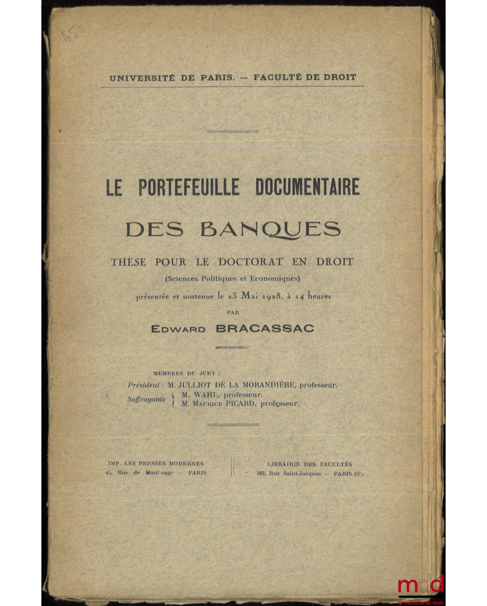 LE PORTEFEUILLE DES BANQUES. Thèse pour le Doctorat présentée et soutenue le 23 mai 1928 (Président : M. Julliot De la Morandière, Suffragants : M. Wahl et M. Maurice Picard)