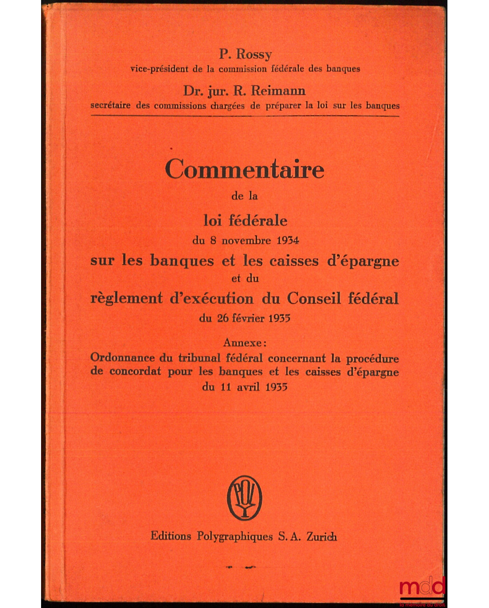 COMMENTAIRE DE LA LOI FÉDÉRALE DU 8 NOVEMBRE 1934 SUR LES BANQUE ET LES CAISSES D’ÉPARGNE ET DU RÈGLEMENT D’EXÉCUTION DU CONSEIL FÉDÉRAL DU 26 FÉVRIER 1935