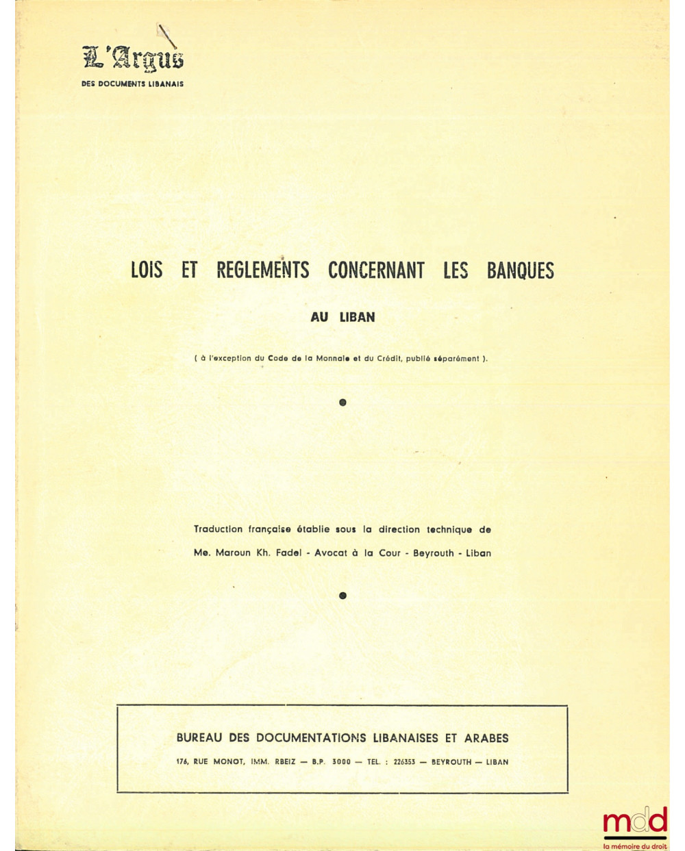LOIS ET RÈGLEMENTS CONCERNANT LES BANQUES AU LIBAN, coll. L’Argus des documents libanais, traduction française sous la direction de Me. Maroun Kh. Fadel
