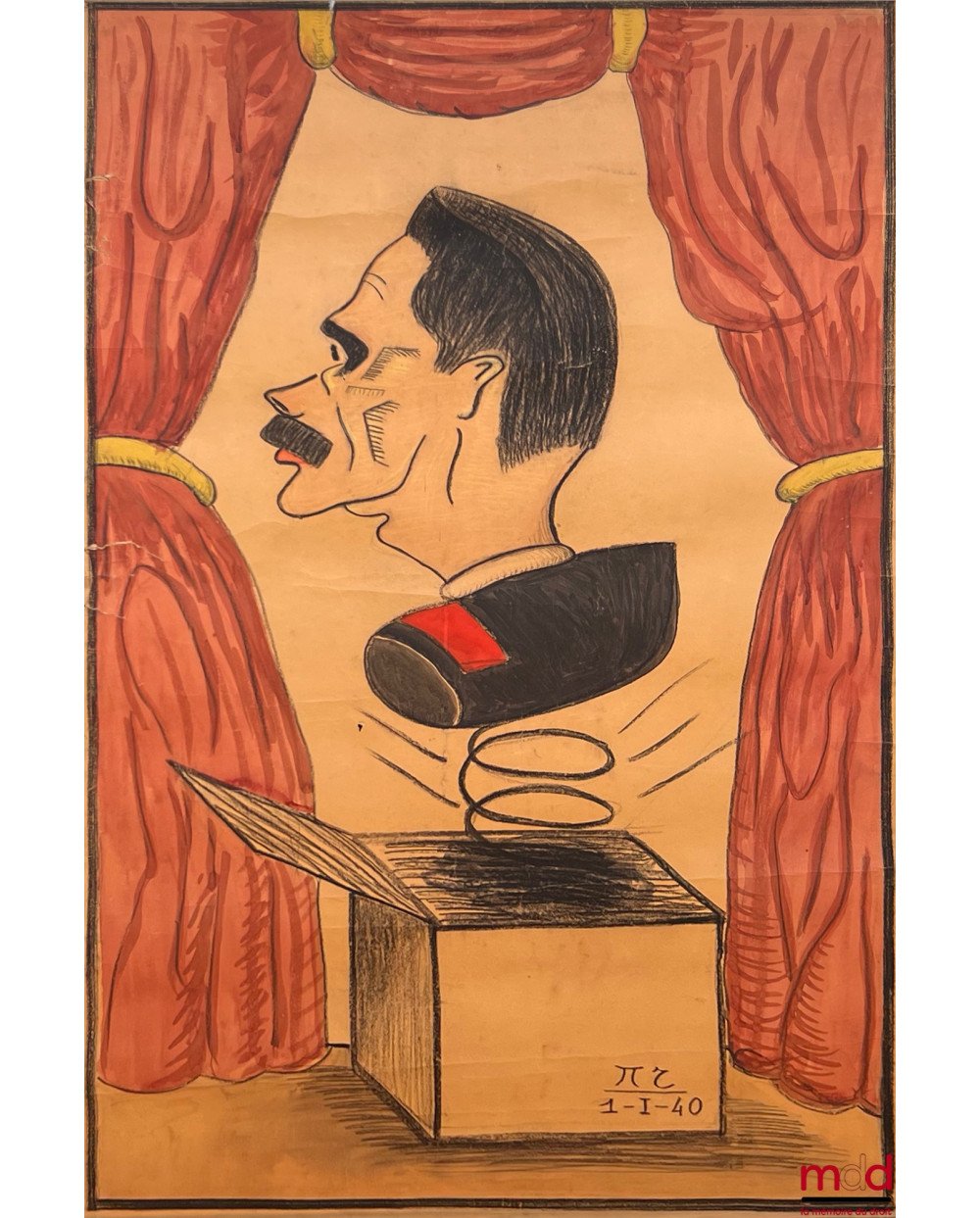 CARICATURE D’UN BUSTE DE PROFESSEUR DE DROIT SORTANT D’UNE BOITE DE FARCE ET ATTRAPE