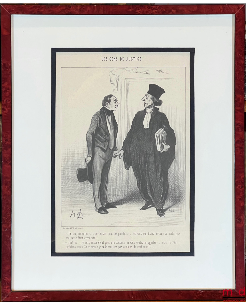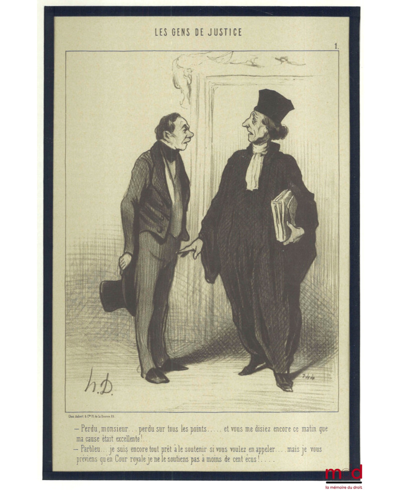 LES GENS DE JUSTICE, Lithographie en noir, Série Les gens de justice., n° 1 :« – Perdu, monsieur... perdu sur tous les points... et vous me disiez encore ce matin que ma cause était excellente !... – Parbleu... je suis encore tout prêt à le soutenir si vous voulez en appeler... mais je vous préviens qu’en Cour royale je ne le soutiens pas à moins de cent écus !... »