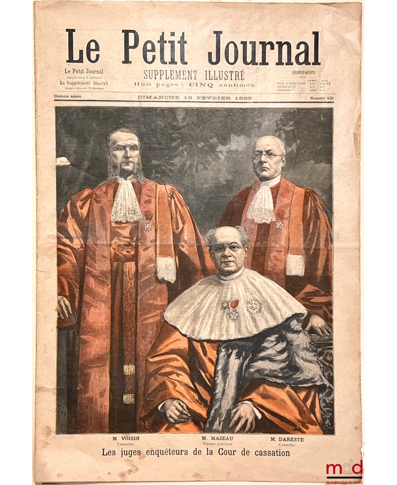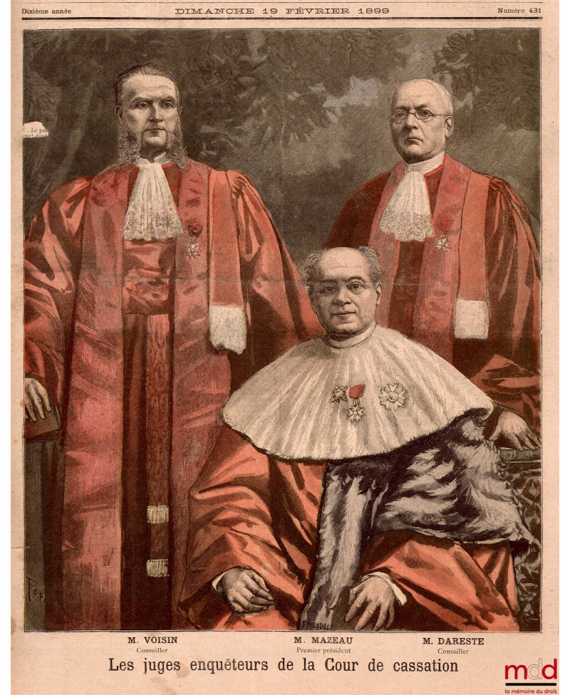 LES JUGES ENQUÊTEURS DE LA COUR DE CASSATION, M. Loew (Président), M. Manau (Procureur général) et M. Chambareaud (Rapporteur), Le Petit Journal, n° 387 du dimanche 17 avril 1898, supplément illustré