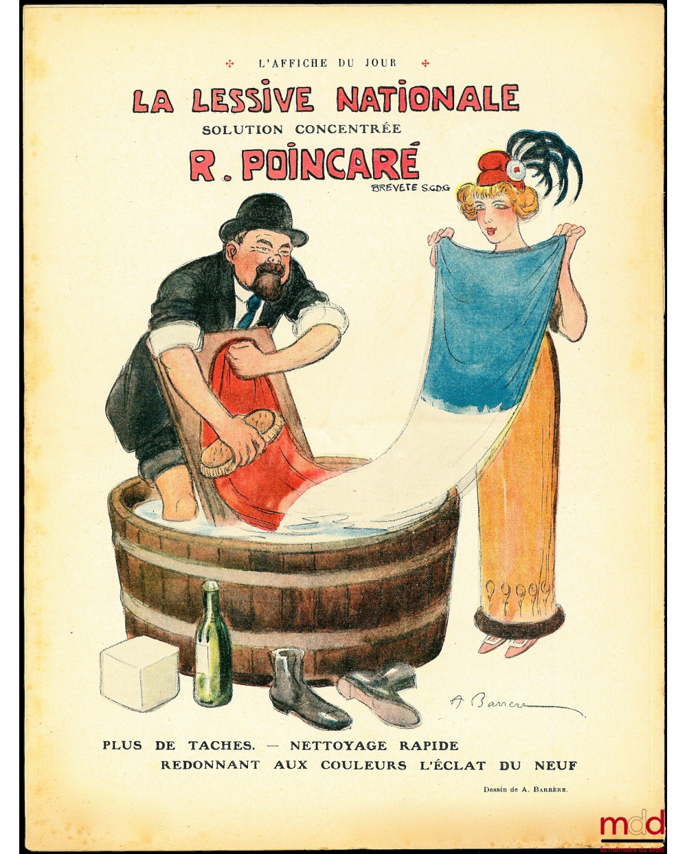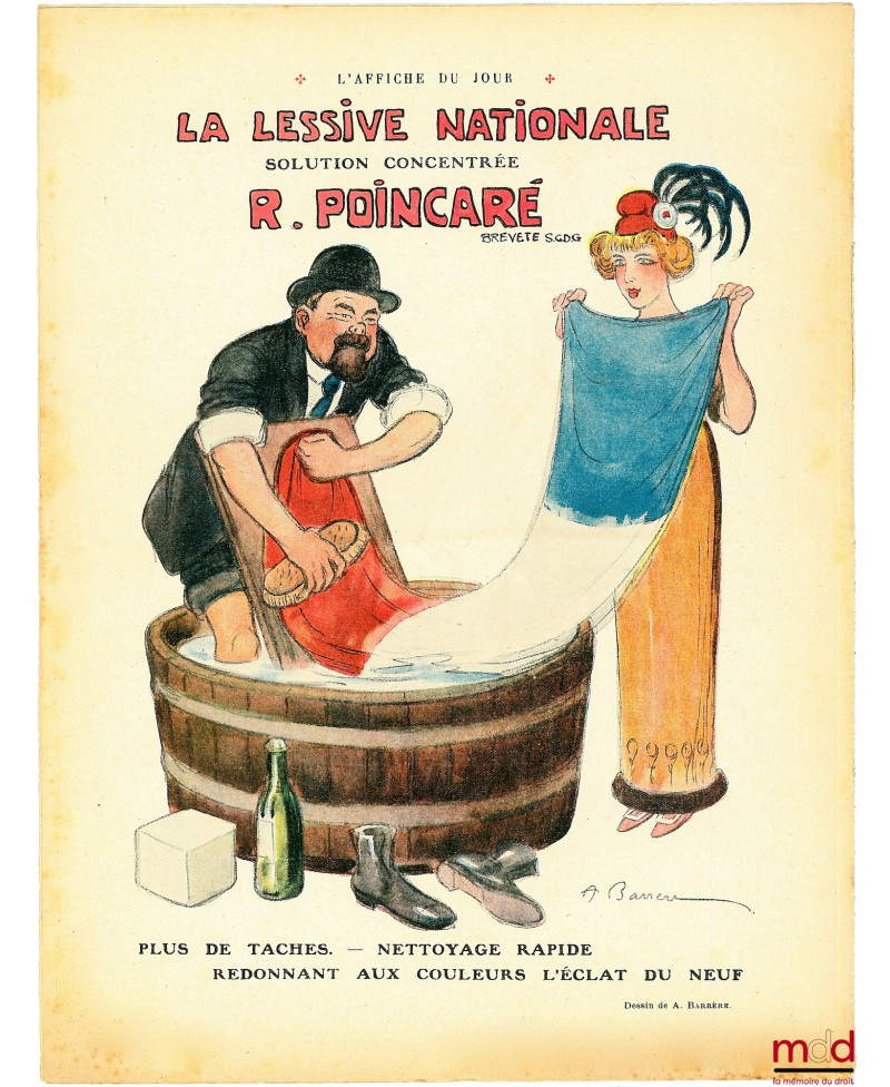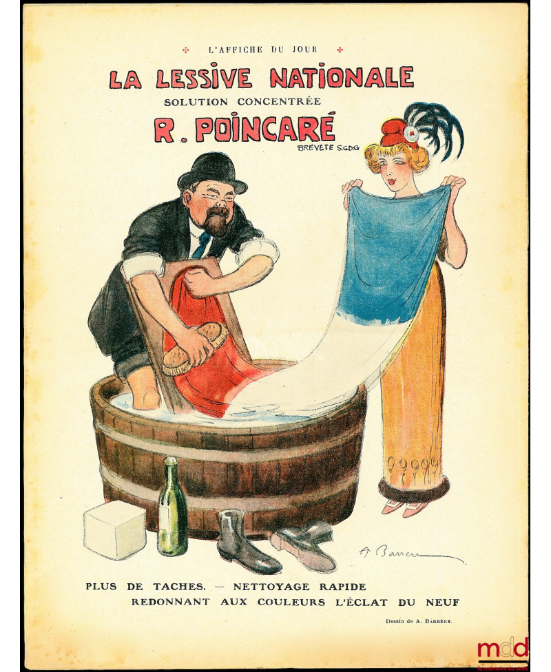 LA LESSIVE NATIONALE Solution concentrée R. POINCARÉ, breveté S.G.D.G. Plus de tâches. — Nettoyage rapide redonnant aux couleurs l’éclat du neuf, L’affiche du jour du dos du journal humoristique LE RIRE, dix-neuvième année, n° 470 - 3 février 1912
