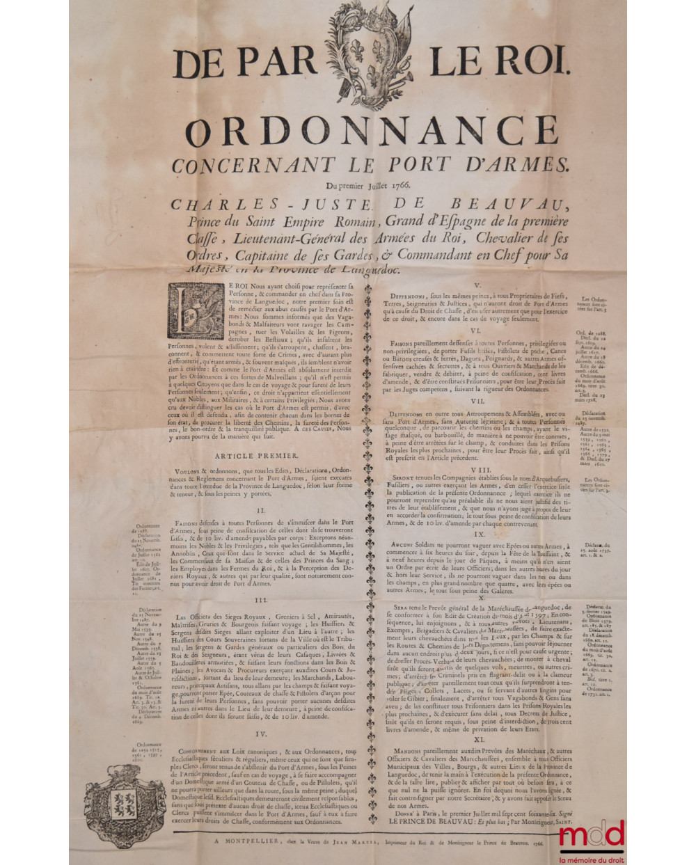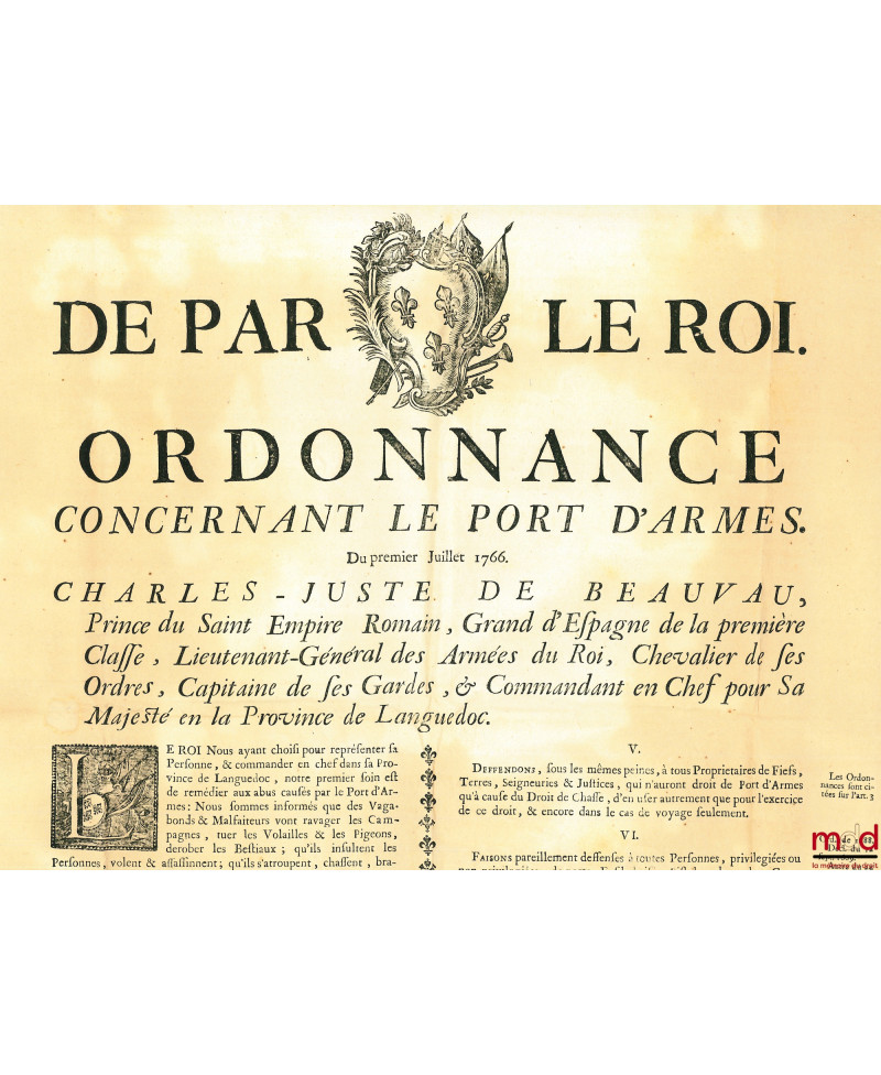 DE PAR LE ROI. ORDONNANCE CONCERNANT LE PORT D’ARMES. Du premier Juillet 1766. Charles-Juste de Beauvau