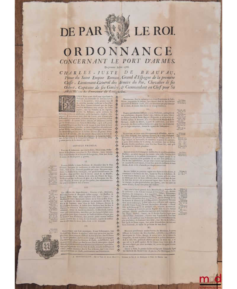 - [dim. de la feuille : 55 X 77 cm.], placard de l’ordonnance du roi concernant le port d’armes en bon état hormis quelques rousseurs claires éparses, 2 ff. collées dans la long. .