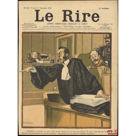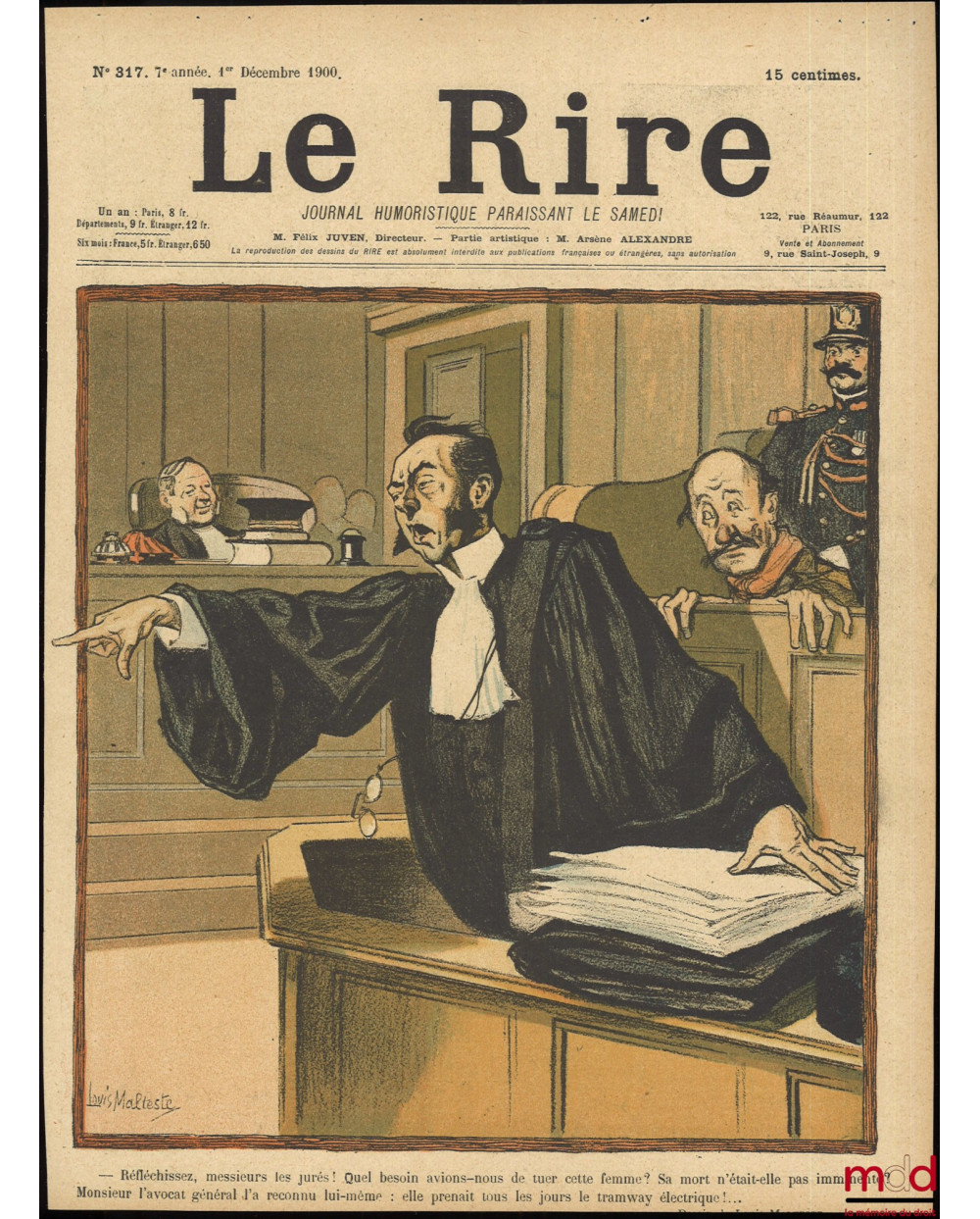 Caricature de L. Malteste reproduite dans le magasine Le Rire [Journal humoristique paraissant le samedi] avec la légende suivante : « – Réfléchissez, messieurs les jurés ! Quel besoin avions-nous de tuer cette femme ? Sa mort n’était-elle pas imminente ? Monsieur l’avocat général l’a reconnu lui-même : elle prenait tous les jours le tramways électrique !… », n° 317 (7e année), 1er décembre 1900