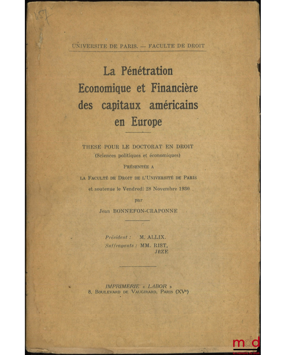 LA PÉNÉTRATION ÉCONOMIQUE ET FINANCIÈRE DES CAPITAUX AMÉRICAINS EN EUROPE, Thèse, Université de Paris - Faculté de droit, (Président : M. Allix ; Suffragants : MM. Rist et Jèze)