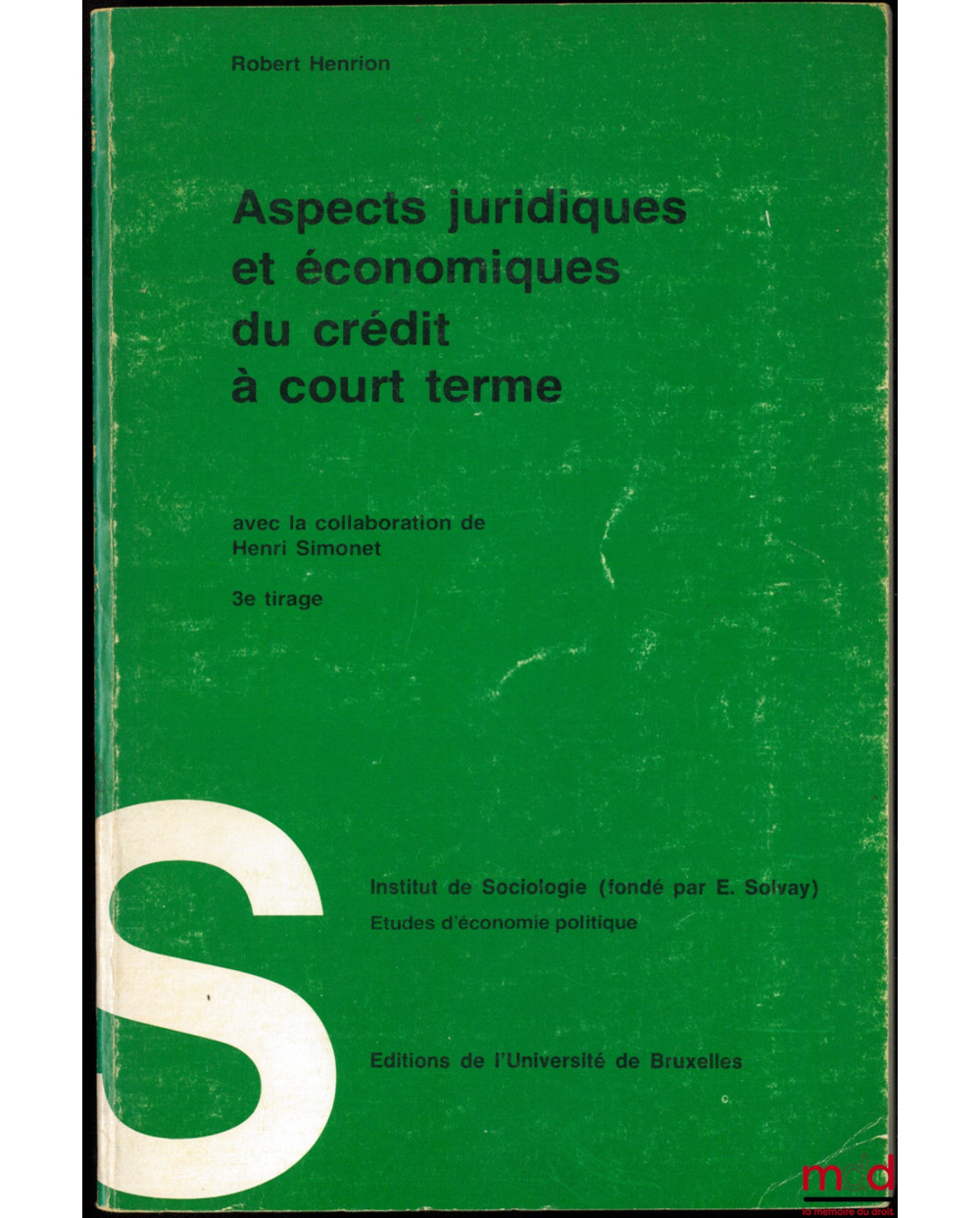 ASPECTS JURIDIQUES ET ÉCONOMIQUES DU CRÉDIT À COURT TERME, avec la collaboration de Henri Simonet, 3ème tirage, Institut de Sociologie, Études d’économie politique