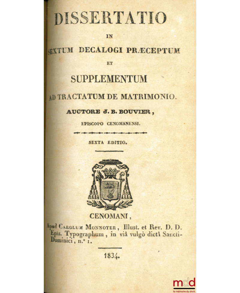 [LYONNET, TRACTATUS DE JUSTITIA ET JURE, HODIERNIS GALLIARUM LEGIBUS ACCOMMODATUS] ;BOUVIER, DISSERTATIO IN SEXTUM DECALOGI PRÆCEPTUM ET SUPPLEMENTUM AD TRACTATUM DE MATRIMONIO, sexta editio