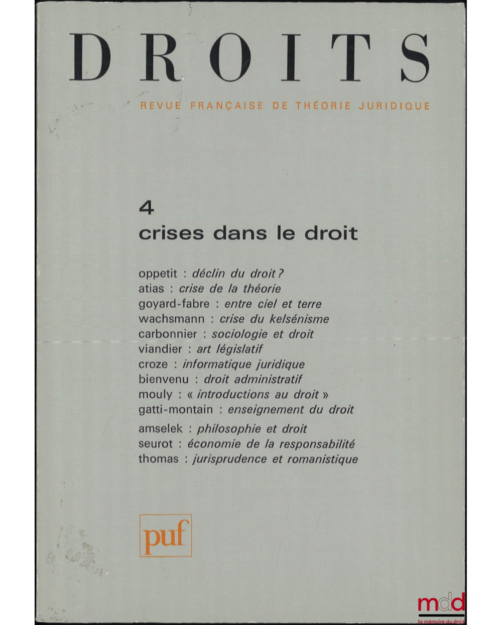 Livraison épuisée de la revue Droits qui contient notamment les articles de S. Rials, Ouverture : Quelles crises ? Quel droit ? B. Oppetit, L’hypothèse du déclin du droit ; Ch. Atias, Une crise de légitimité seconde ; S. Goyard-Fabre, Le droit est-il de ce monde ? P. Wachsmann, Le kelsénisme est-il en crise ? Entretien avec jean Carbonnier : Sociologie juridique et crise du droit ; A. Viandier, La crise de la technique législative ; H. Croze, Le droit malade de son information ; J.-J. Bienvenu, Le droit adminsitratif ; une crise sans catastrophe ; Ch. Mouly, Crise des introductions au droit ; J. Gatti-Montain, Le droit et son enseignement ; un demi-siècle de réflexions ; P. Amselek, L’interpellation actuelle de la réflexion philosophique par le droit ; Fr. Seurot, La théorie économique de la responsabilité et le positivisme juridique ; Y. Thomas, La romanistique et la notion de jurisprudence.