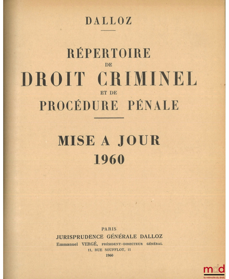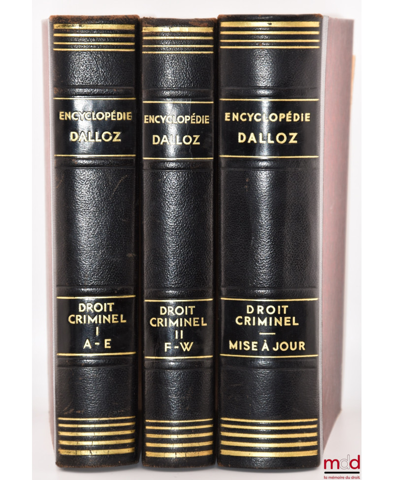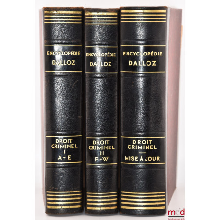 Constatant que le grand répertoire général, qui était une des œuvres majeures de la maison Dalloz, avait progressivement réduit jusqu’à ne plus contenir que 4 vol. dans son édition de 1947, l’éditeur décida à partir de 1950 de réaliser une encyclopédie juridique divisée par matières. Nous avons ici les deux volumes consacrés au droit criminel. On est toujours surpris à la lecture de ces codes qui ont été vulgarisés dans leur utilisation, par la clarté et la profondeur des notices sur les principes théoriques et les nombreuses références aux meilleurs manuels et traités de la matière ; ceci s’explique par le fait qu’elles ont été rédigées par les meilleurs plumes du moment : MM. Bouzat, Brethe de la Gressaye, Derrida, Gabolde, Isorni, Luchaire, Merle, Ripert, de Soto, Vitu et Vouin, pour ne citer que les plus emblématiques.