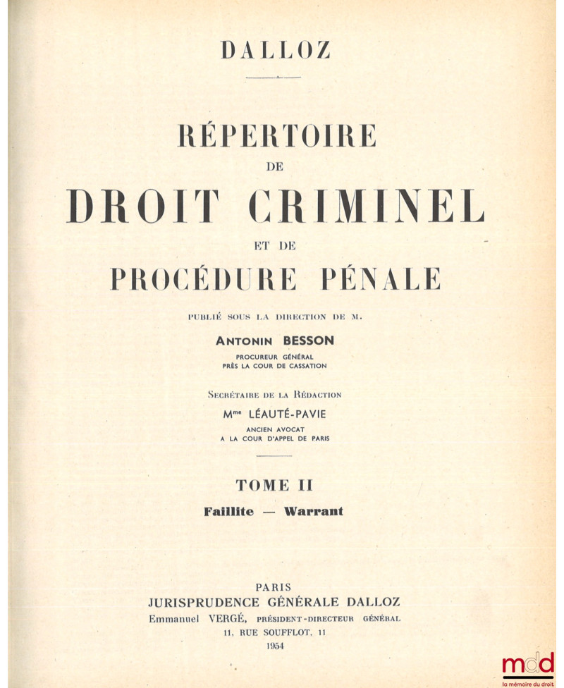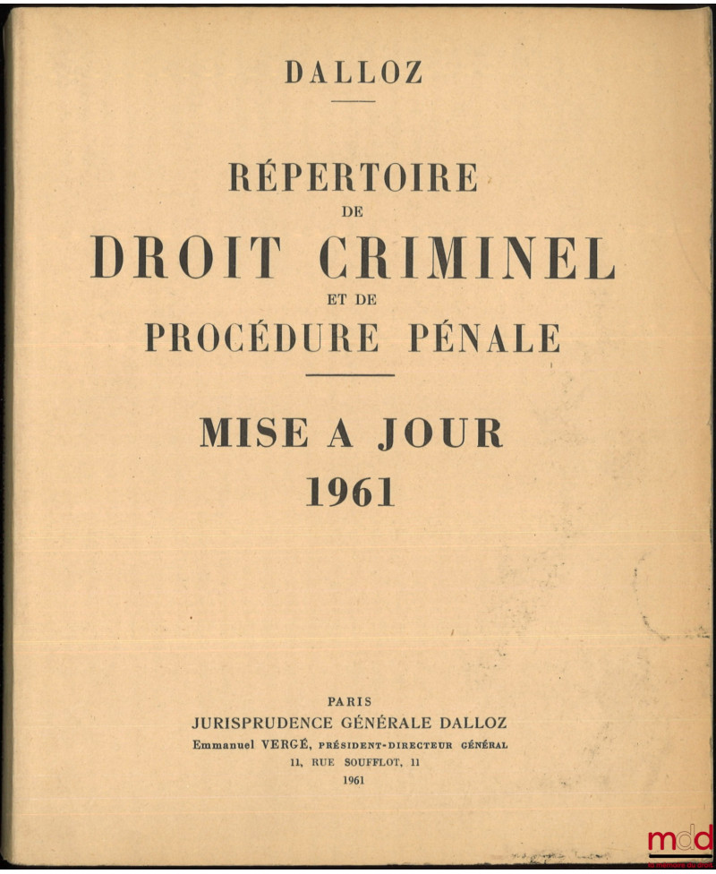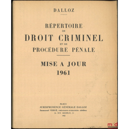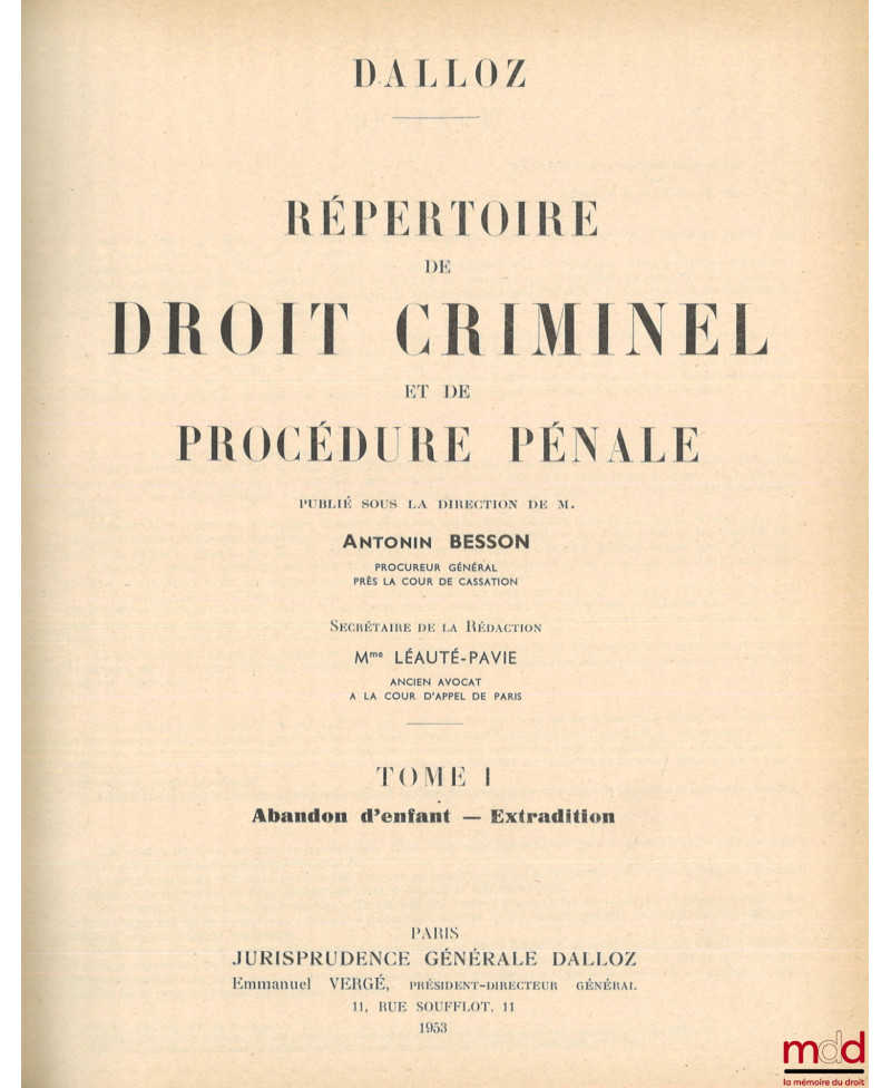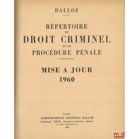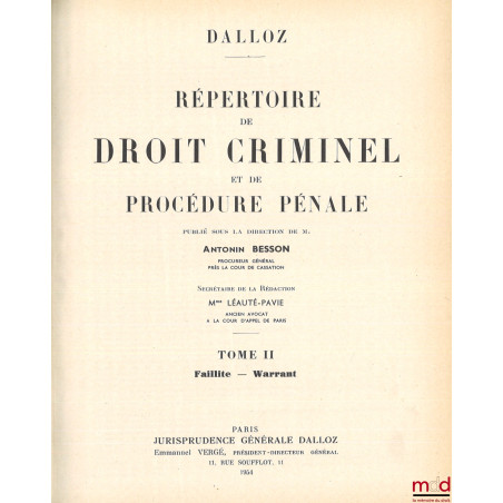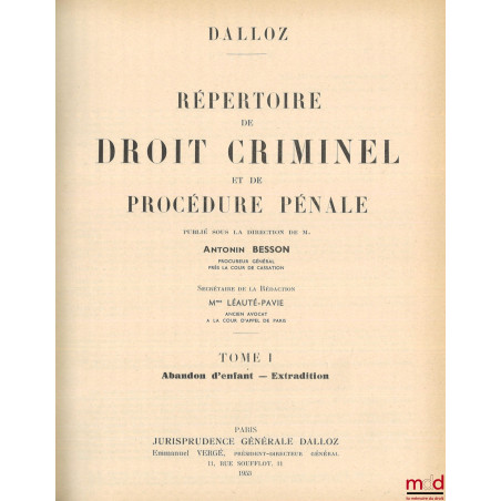 RÉPERTOIRE DE DROIT CRIMINEL ET DE PROCÉDURE PÉNALE publié sous la direction de Antonin BESSON, t. I : Abandon d’enfant - Extradition, t. II : Faillite - Warrant, Mise à jour 1960, Mise à jour 1961