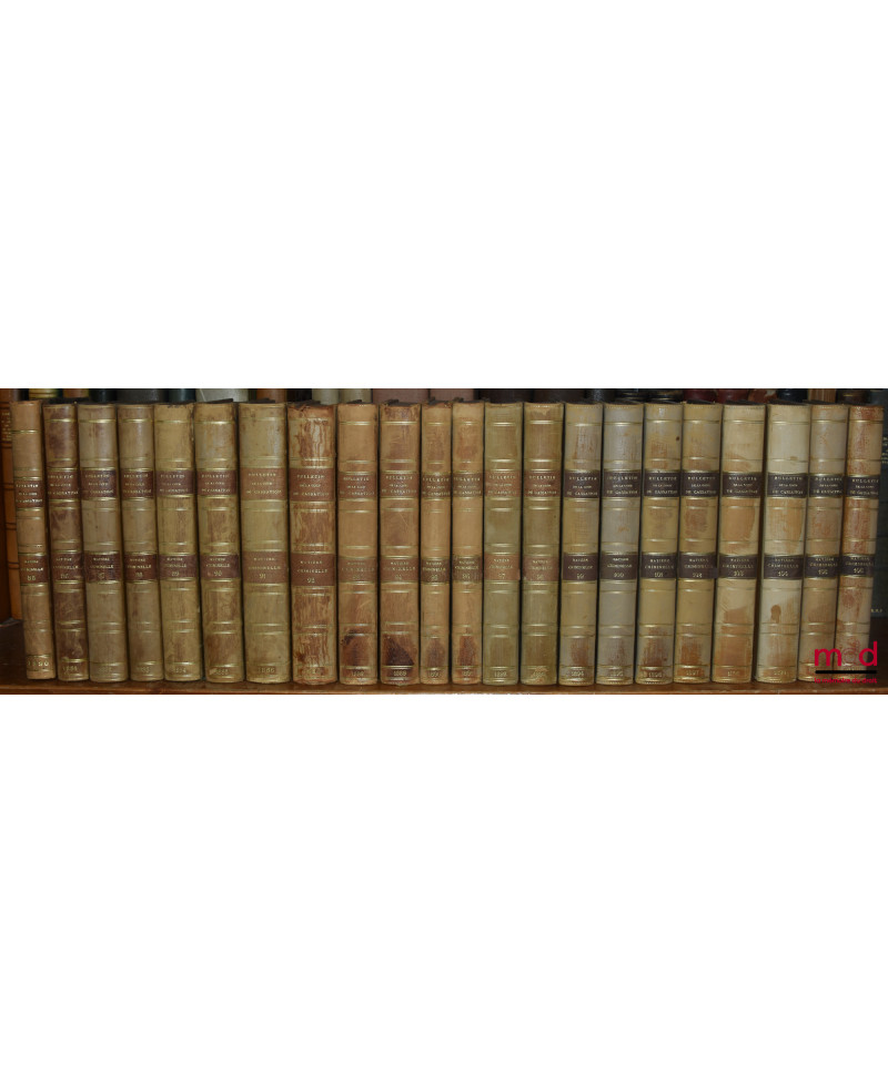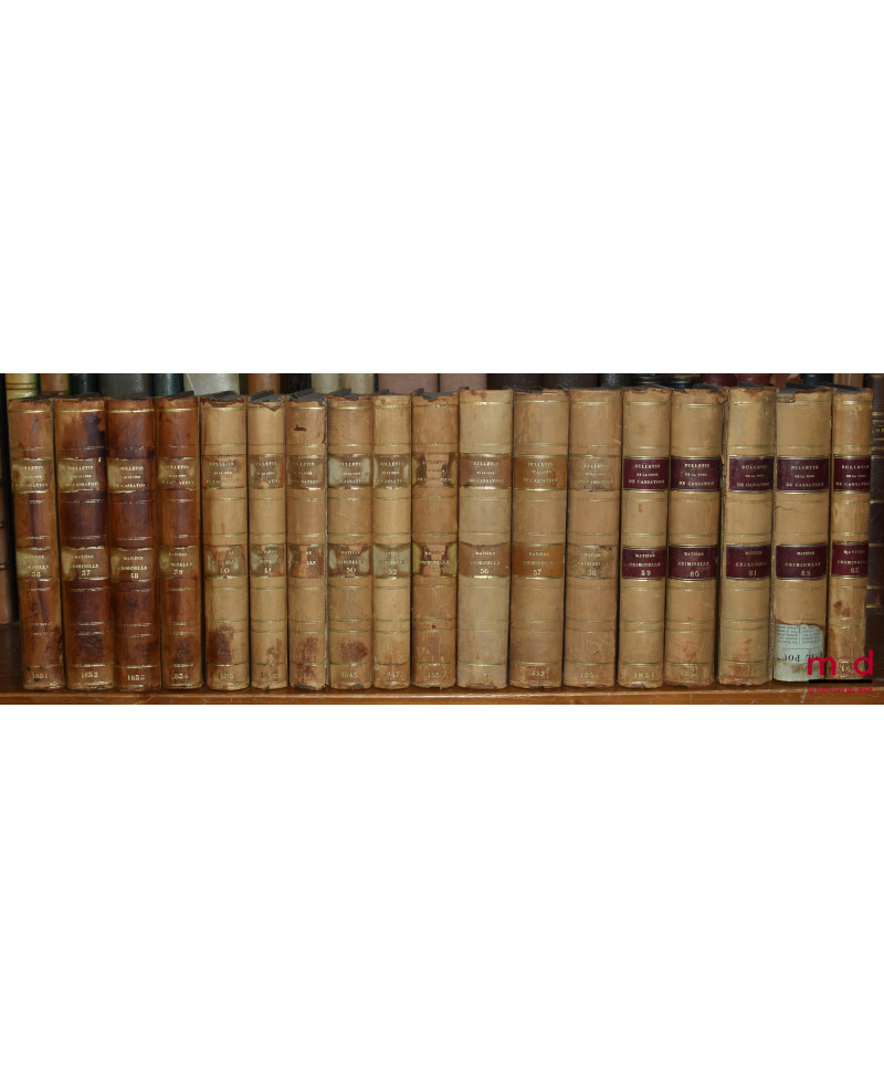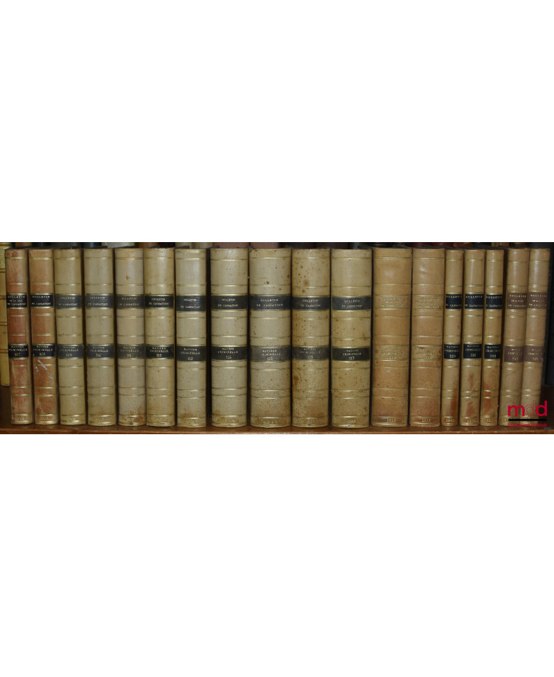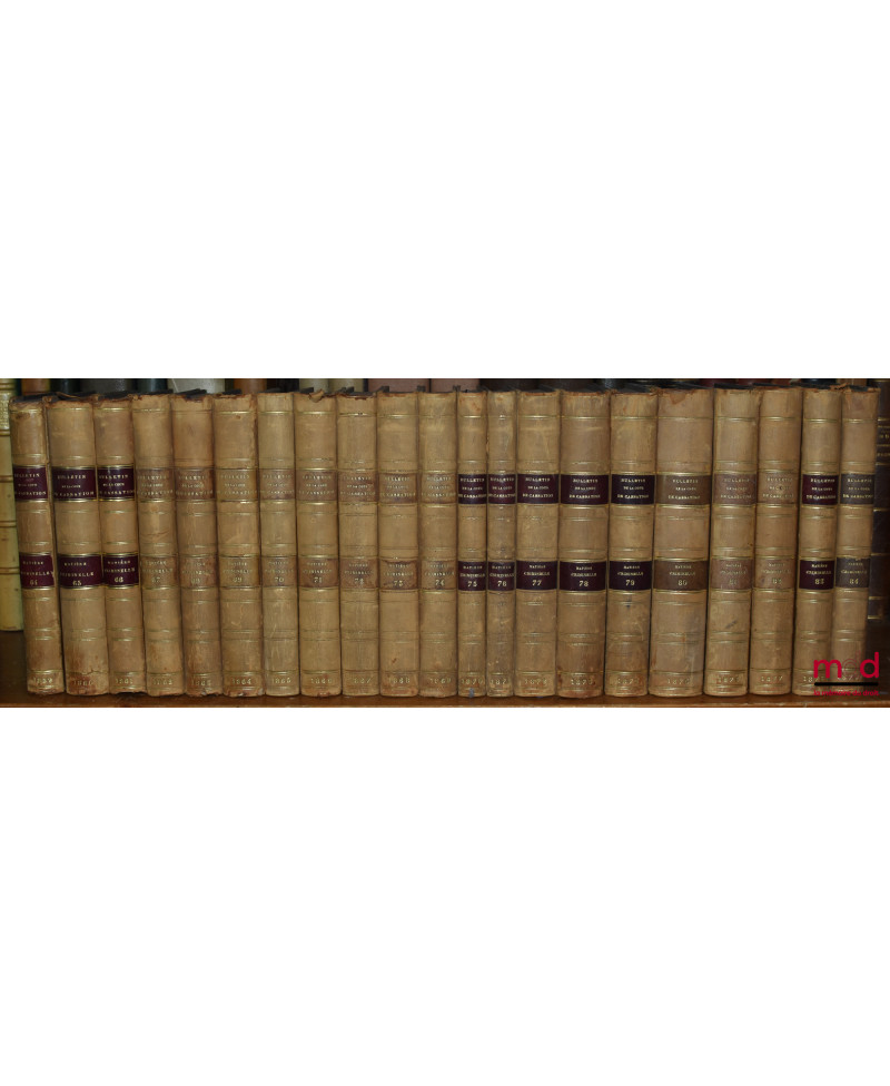 Description : 95 années en 98 vol. in-8, demi-basane ocre, tit. et tom. dorés sur pc. de cuir, filets dorés soulignants et encadrants, tables richement ornées de frises et fleurons dorés, (certains ouvrages usés avec coiffes manquantes et dos insolés ou tachés, un vol. avec mq. de cuir important au dos, qq. dos et plats détachés, qq. rousseurs et piqûres à l’int., mq. les années 1837-1841, 1843, 1844, 1846, 1848, 1849 et 1934).