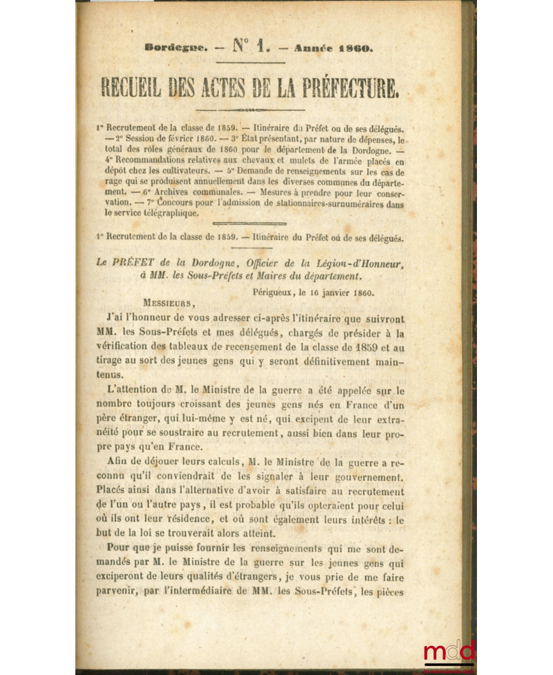 RECUEIL DES ACTES DE LA PRÉFECTURE DE DORDOGNE, années 1860, 1861