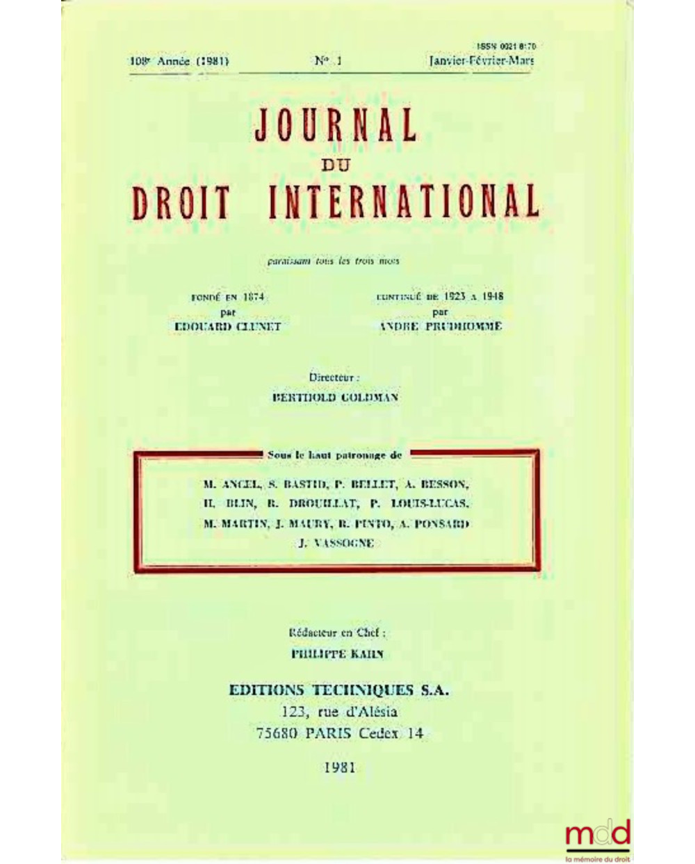 JOURNAL DU DROIT INTERNATIONAL, 108ème année (1981) n° 1 (janvier-février-mars)