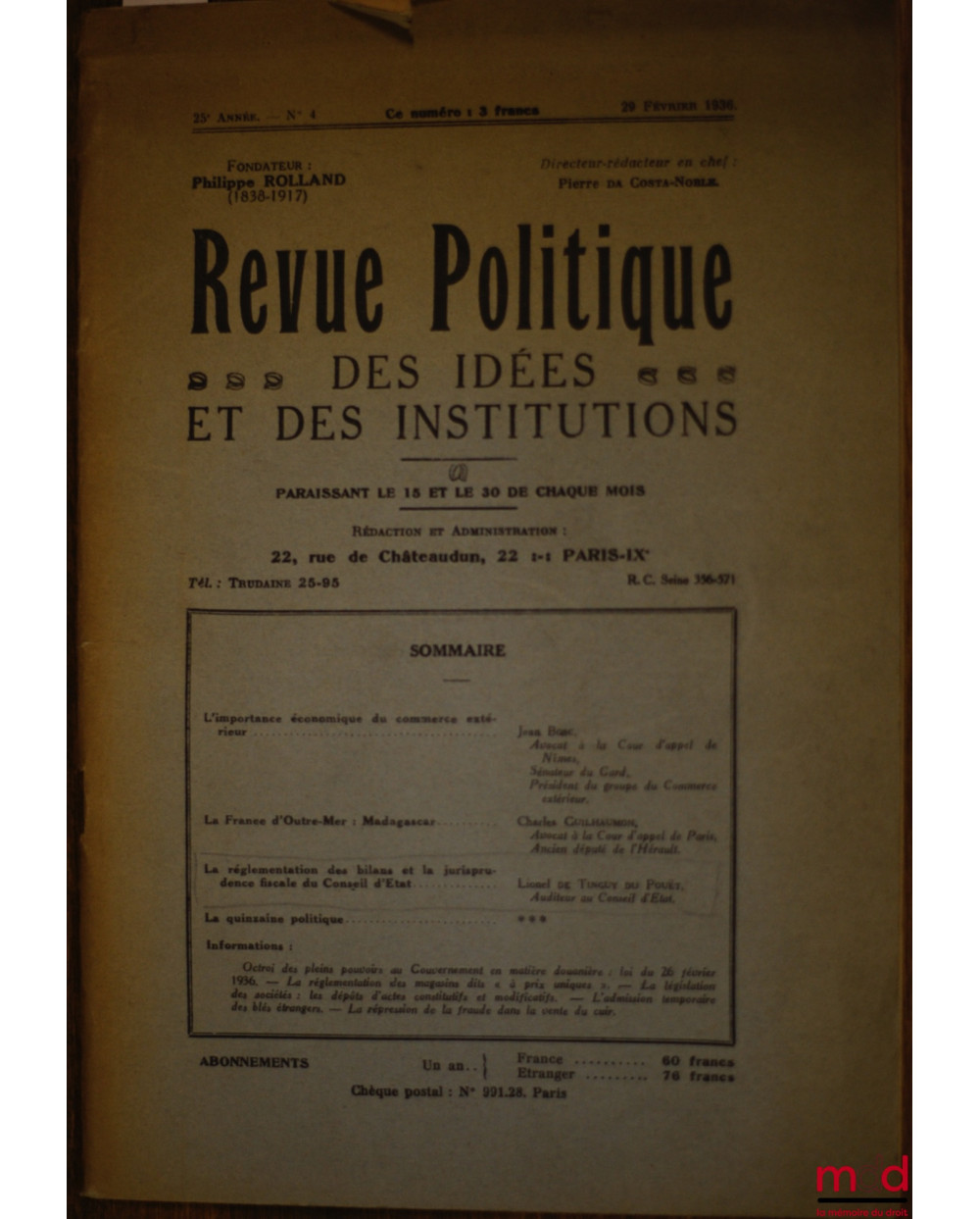 LA RÉGLEMENTATION DES BILANS ET LA JURISPRUDENCE FISCALE DU CONSEIL D’ÉTAT, extrait de la Revue politique des idées et des institutions, 25ème année, n° 4 du 29 février 1936