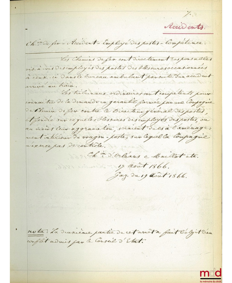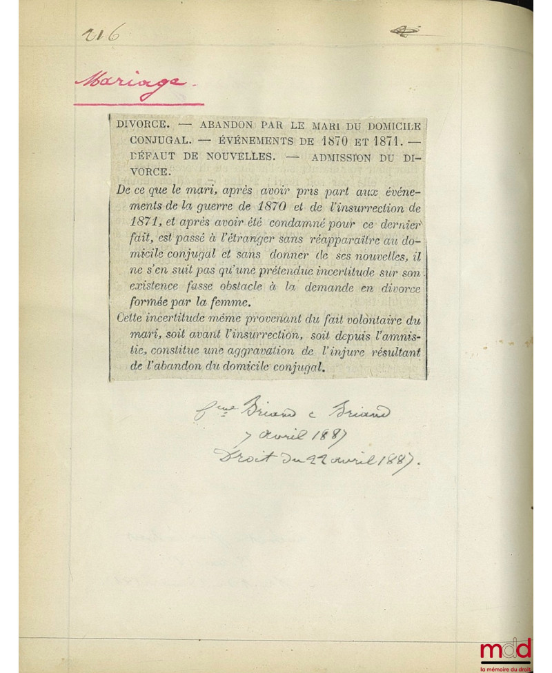 7 vol., manuscrits à l’encre d’époque pour les 4 premiers vol., coupures de journeaux collés avec annotations manuscrites pour les 3 derniers vol., demi-basane et demi-chagrin vert, tit. & années sur dos lisses avec filets dorés, hauteur 19 à 21 cm, (3 coiffes de tête manquantes, 1 mors fendu au 6ème vol., coupes et coins lég. émoussés), intérieur très frais, [Cet ouvrage provient de la bibliothèque des Avoués près la cour d’appel de Paris, il peut être frappé aux armes de la Chambre des Avoués et revêtir des marques de bibliothèque], 492 / 450 / 524 / 384 / 428 / 444 / 346 p.