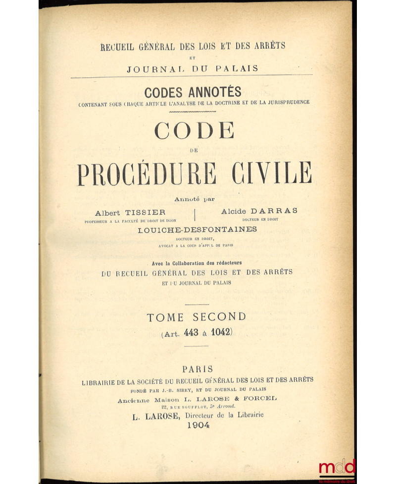 CODE DE PROCÉDURE CIVILE annoté par Albert TISSIER, Alcide DARRAS et LOUICHE-DESFONTAINES, avec la collaboration des Rédacteurs du Recueil Général des Lois et des Arrêts et du Journal du Palais, Codes annotés contenant sous chaque article l’analyse de la doctrine et de la jurisprudence, RGLA et du JP