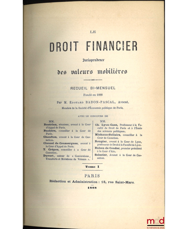 LE DROIT FINANCIER. Jurisprudence des valeurs mobilières et des sociétés (et des opérations de Bourse). Recueil bi-mensuel (puis mensuel à partir de 1906) fondé et dirigé par Édouard BADON-PASCAL, de 1888 [tête de collection] à 1939 [queue de coll. en 1940]
