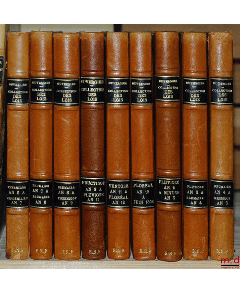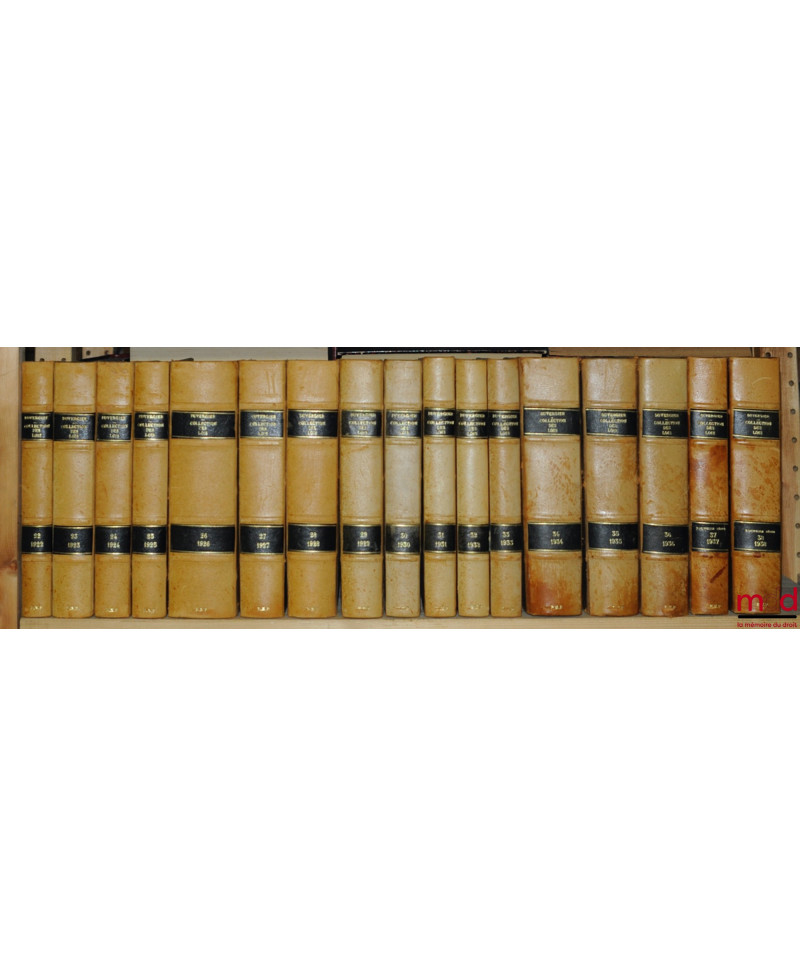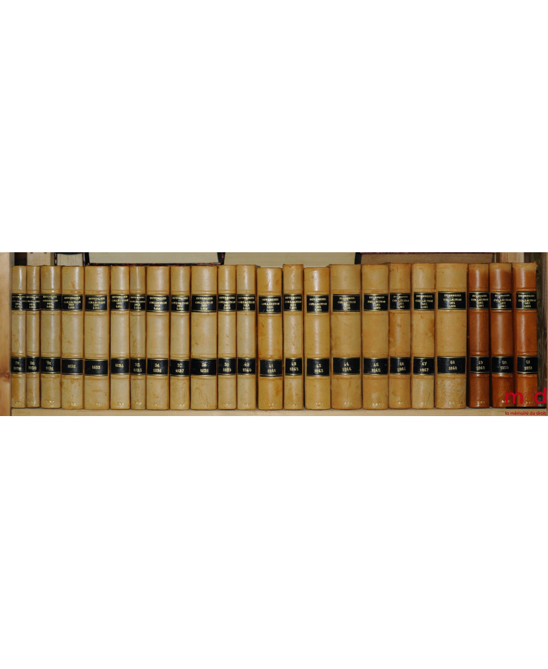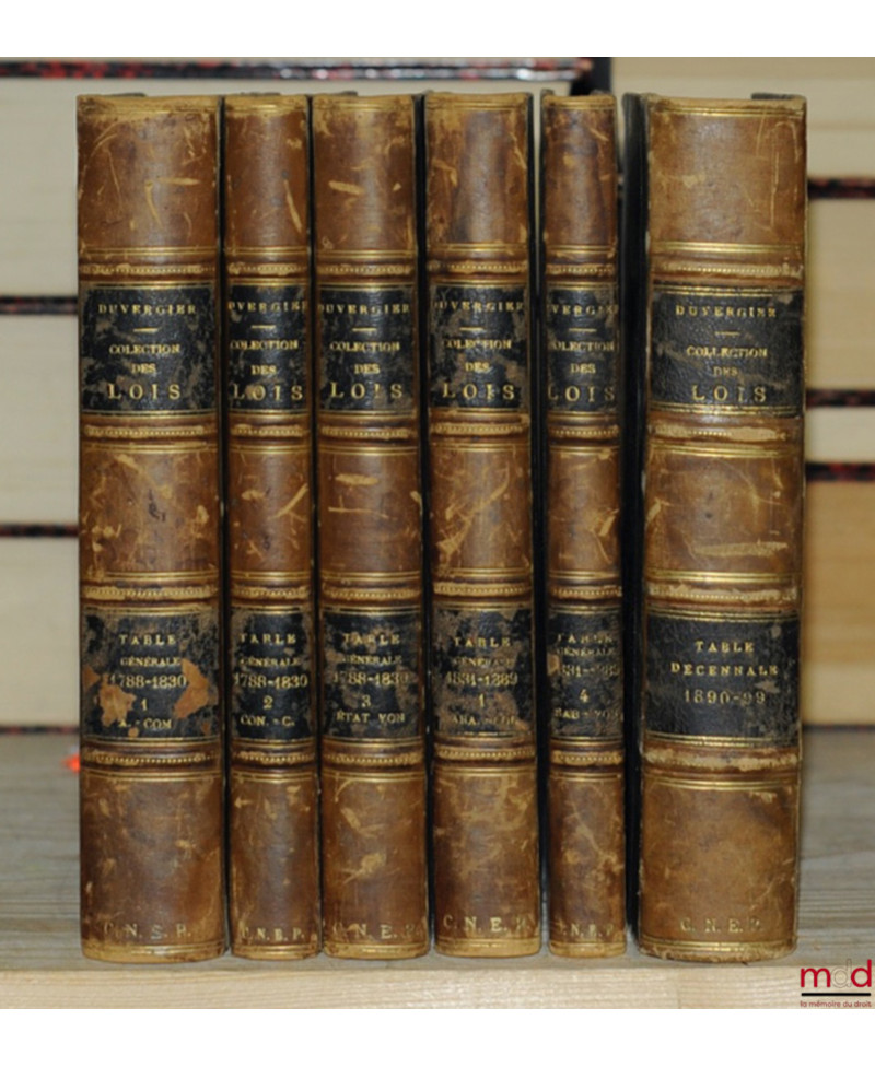 COLLECTION COMPLÈTE DES LOIS, Décrets, Ordonnances, Réglements, AVIS DU CONSEIL-D’ÉTAT, publié sur les éditions officielles du Louvre ; de l’Imprimerie nationale, par Baudouin ; et du Bulletin des Lois ; (De 1788 à 1830 inclusivement, par ordre chronologique), continué depuis 1830, Avec un choix d’Actes inédits, d’Instructions ministérielles, et de Notes sur chaque Loi, indiquant : 1° les Lois analogues ; 2° les Décisions et Arrêts des Tribunaux et du Conseil-d’État ; 3° les Discussions rapportées au Moniteur Suivi d’une table analytique et raisonnée des matières, par J. B. DUVERGIER, Avocat à la Cour royale de Paris et continuateur de Toullier, 2e édition, 1788 à 1949 (« Nouvelle Série » à partir de 1909, continuer par Gustave Lange, puis en 1916 par L. Boquet)Comprends : LÉGISLATION DE LA GUERRE DE 1914, Lois, Décrets, Arrêtés ministérielles et Circulaires ministérielles, avec références au Recueil Sirey, au Journal du Palais et aux Pandectes Françaises (28 juillet 1914 - 15 janvier 1915)Tables 1788-1830 (3 vol.), 1831-1889 (2 vol. / mq. vol. 2 & 3) et 1889-1900 (1 vol.)