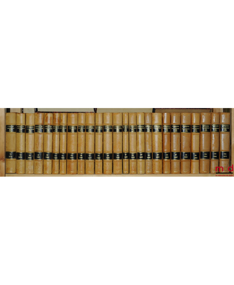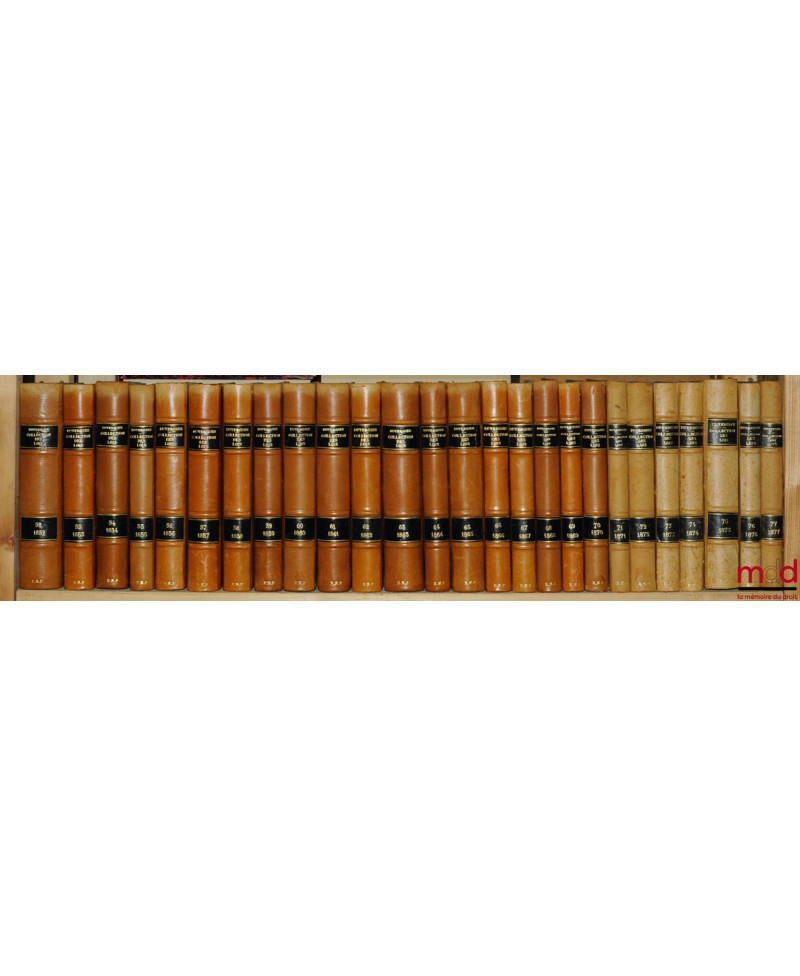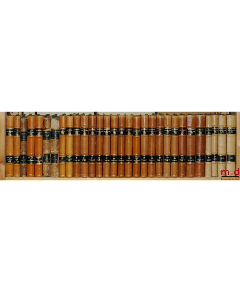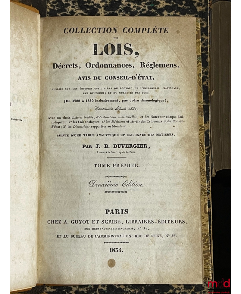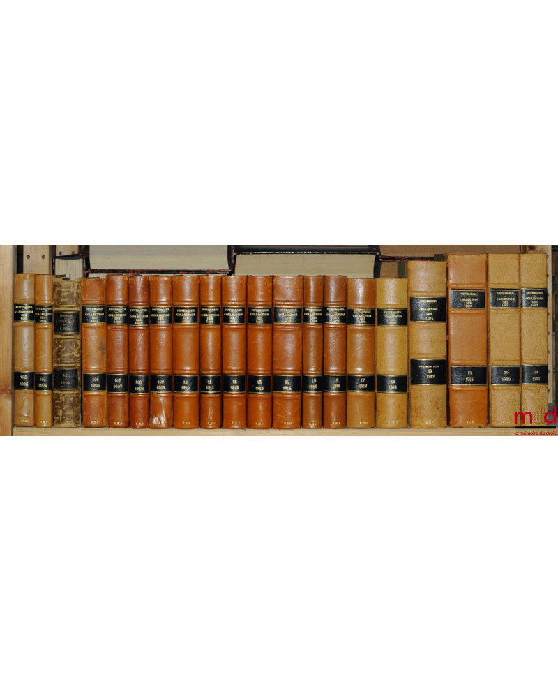 COLLECTION COMPLÈTE DES LOIS, Décrets, Ordonnances, Réglements, AVIS DU CONSEIL-D’ÉTAT, publié sur les éditions officielles du Louvre ; de l’Imprimerie nationale, par Baudouin ; et du Bulletin des Lois ; (De 1788 à 1830 inclusivement, par ordre chronologique), continué depuis 1830, Avec un choix d’Actes inédits, d’Instructions ministérielles, et de Notes sur chaque Loi, indiquant : 1° les Lois analogues ; 2° les Décisions et Arrêts des Tribunaux et du Conseil-d’État ; 3° les Discussions rapportées au Moniteur Suivi d’une table analytique et raisonnée des matières, par J. B. DUVERGIER, Avocat à la Cour royale de Paris et continuateur de Toullier, 2e édition, 1788 à 1949 (« Nouvelle Série » à partir de 1909, continuer par Gustave Lange, puis en 1916 par L. Boquet)Comprends : LÉGISLATION DE LA GUERRE DE 1914, Lois, Décrets, Arrêtés ministérielles et Circulaires ministérielles, avec références au Recueil Sirey, au Journal du Palais et aux Pandectes Françaises (28 juillet 1914 - 15 janvier 1915)Tables 1788-1830 (3 vol.), 1831-1889 (2 vol. / mq. vol. 2 & 3) et 1889-1900 (1 vol.)