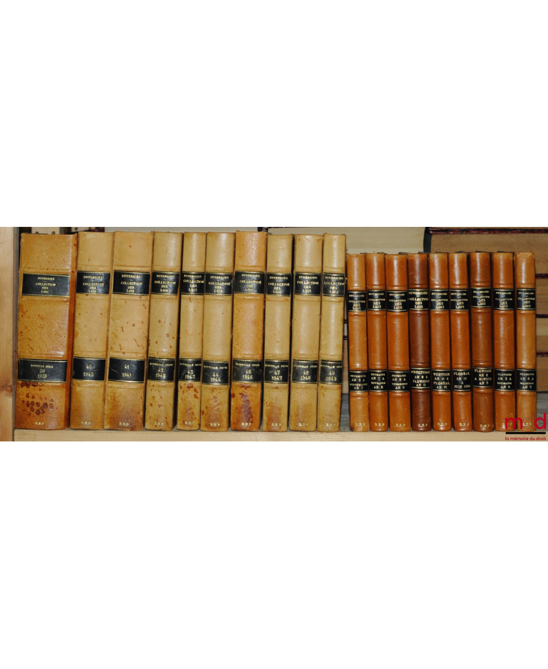 Exceptionnel exemplaire complet (sauf 2 vol. de tables) du célèbre répertoire Duvergier de 1788 à 1949 et qui contient, outre le texte de l’ensemble des lois, décrets et instructions administratives, des résumés substantiels des débats parlementaires ainsi que les principales décisions de jurisprudence. Collection de référence exceptionnelle… unique sur la période !