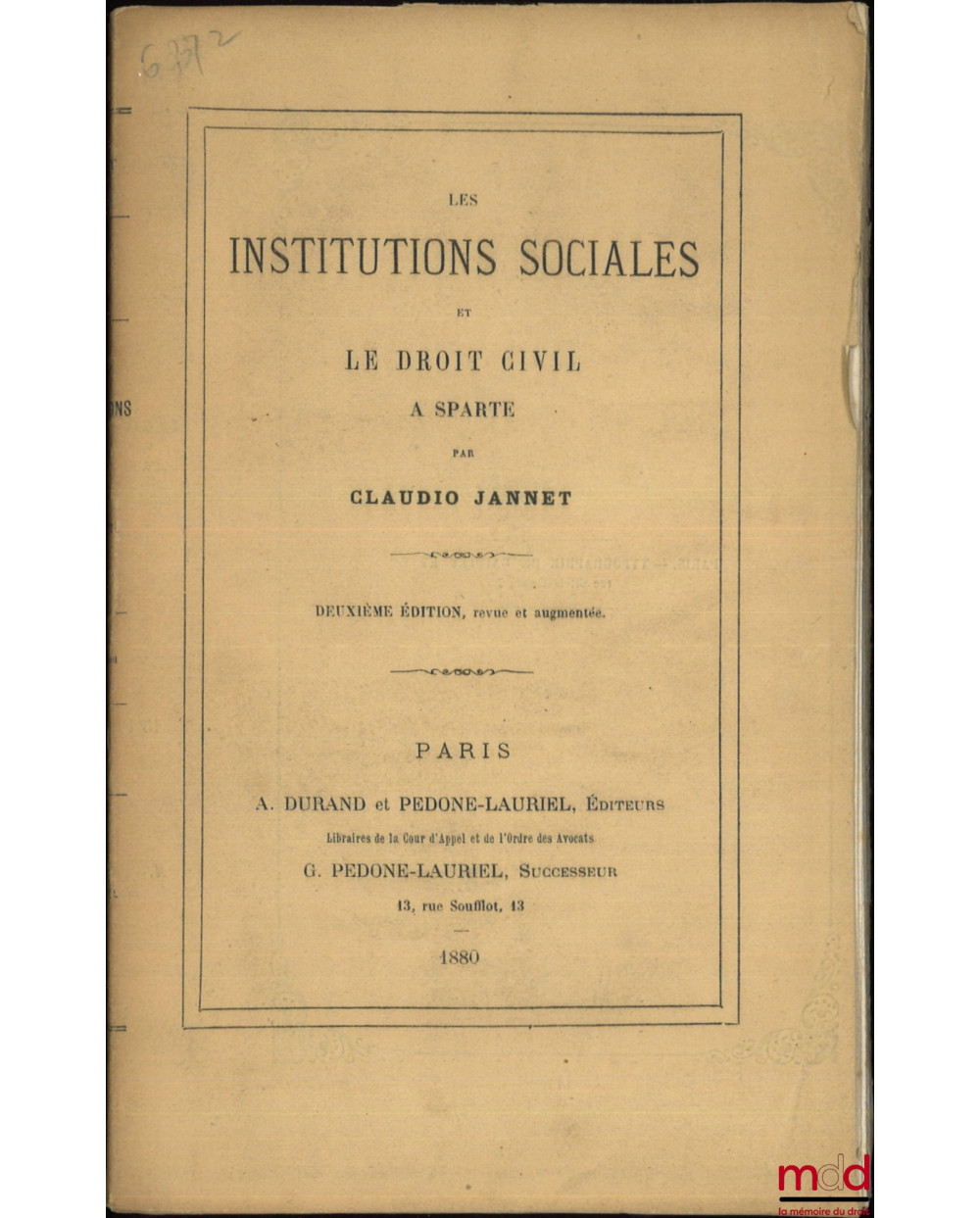 LES INSTITUTIONS SOCIALES ET LE DROIT CIVIL À SPARTE, 2e éd. revue et augmentée