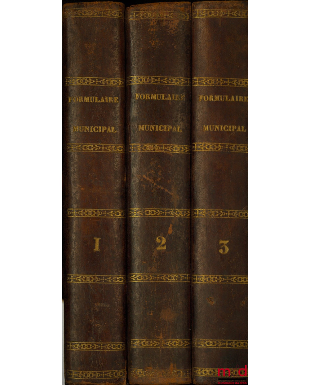 FORMULAIRE MUNICIPAL CONTENANT L’ANALYSE, PAR ORDRE ALPHABÉTIQUE, DE TOUTES LES MATIÈRES QUI SONT DU RESSORT DE L’ADMINISTRATION MUNICIPALE AVEC LE TEXTE DES LOIS, ORDONNANCES ET RÈGLEMENTS QUI S’Y RAPPORTENT ET UN RECUEIL COMPLET DE FORMULE DE TOUS LES ACTES QU’ON PEUT ÊTRE DANS LE CAS DE RÉDIGER DANS UNE MAIRIE, 2e éd.